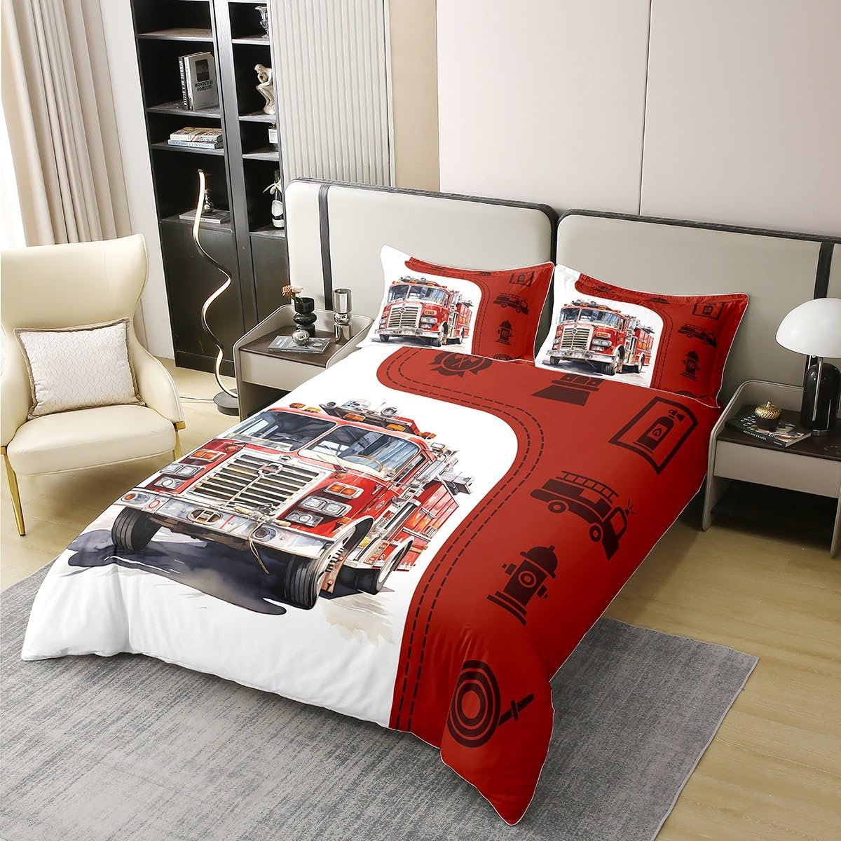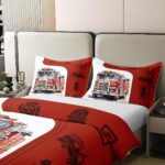 100% Cotton 3D Fire Truck Duvet Cover Queen Size 3 Pcs Fire Fighting Equipment Silhouette Bedding Set for Kids Teens Adults Red Grid Watercolor Fire Engine Comforter Cover,2 Pillowcases,No Comforter