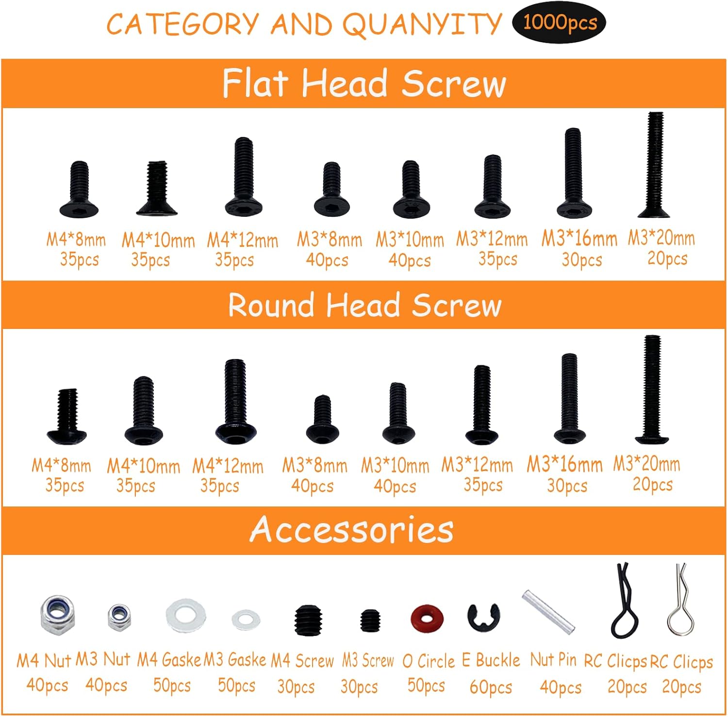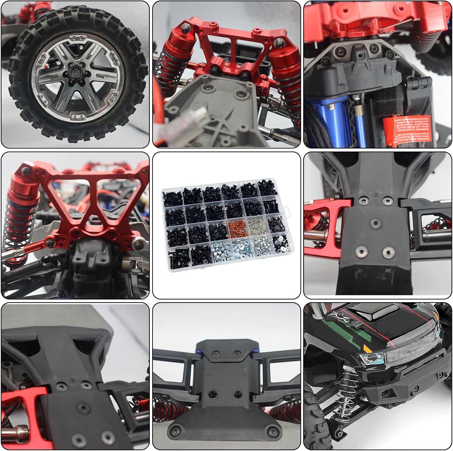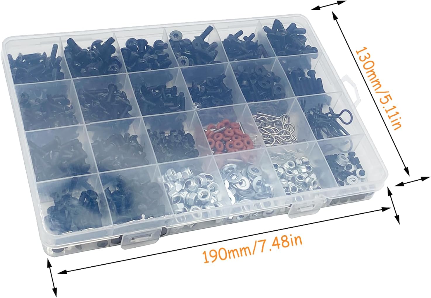 RC screw are available in 24 sizes(Approx 7.48in*5.11in), you can choose different sizes of screws according to various occasions, sorted in plastic boxes and stored in different grids to prevent screws from mixing.