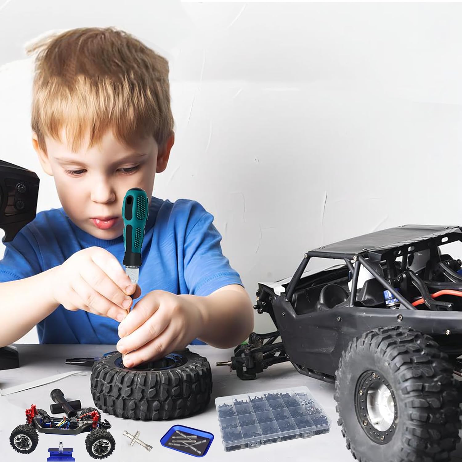 RC car tool kit is a DIY that can meet all your needs for remote control car maintenance, perfect for your remote control car, such as like short course, trucks buggy, crawlers, on-road, off road.
