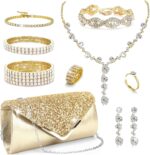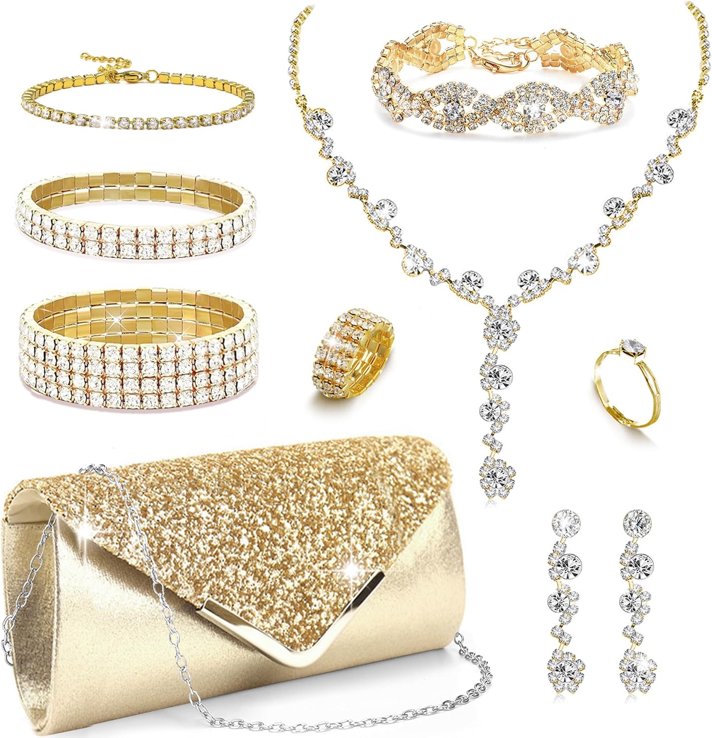 10Pcs Silver Rhinestone Jewelry Set for Women Bride Wedding Prom Jewelry Evening Rhinestone Sparkly Clutch Purse Bag Necklace Tennise Layered Bracelets CZ Ring Crystal Drop Earring Set Silver Shiny Costume Kit