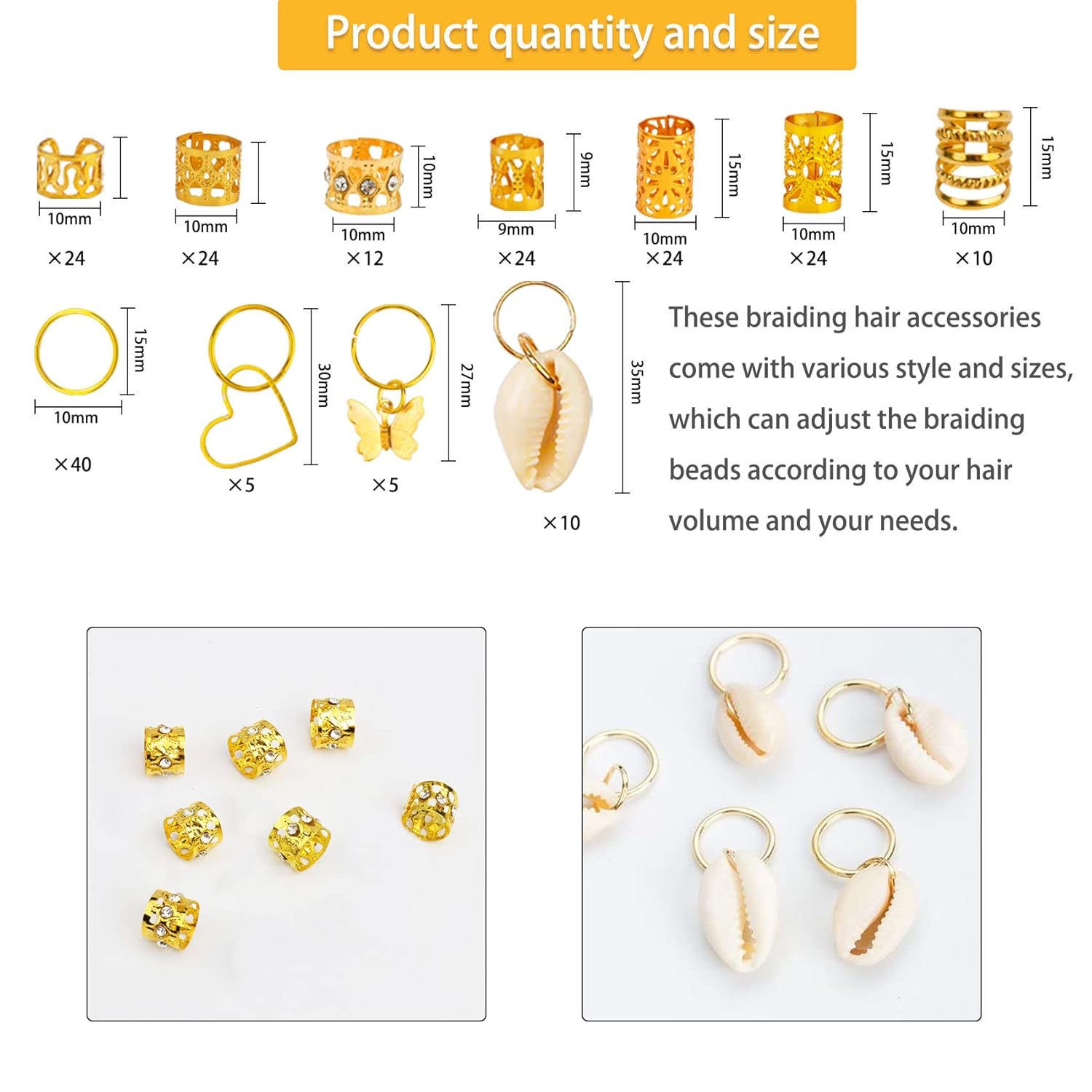 Enough Quantity: You will received 202 pieces braids hair jewelry with storage box. Total 11 different shapes, include 130 pcs hair beads, 12 pcs rhinestone hair cuffs, 40 pcs braid hair rings, 10 pcs shell hair pendent, 5 pcs heart shape hair charms, 5 pcs butterfly shape DIY hair pendent charms, large quantity for your daily use.
