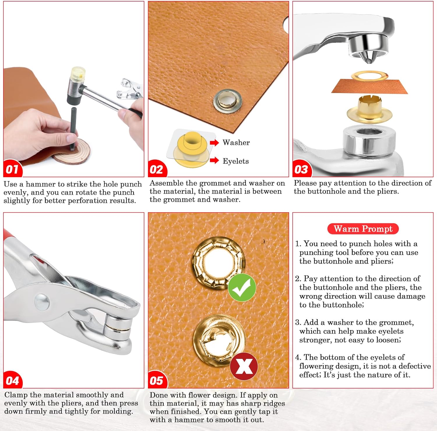 Precautions for Use – The grommet outside diameter is 1/2 inch and the inside diameter is 6mm (nearly 1/4 inch, but slightly less than 1/4 inch). Please choose the right size that you need according to the product dimension description. Please pay attention to the direction of the buttonhole and the pliers, the wrong direction will cause damage to the buttonhole and make pliers handle bend. Add the washer to the grommet, which can help make eyelets stronger, not easy to loosen. The bottom of the eyelets is flowering design, it is not a defective effect, please kindly note