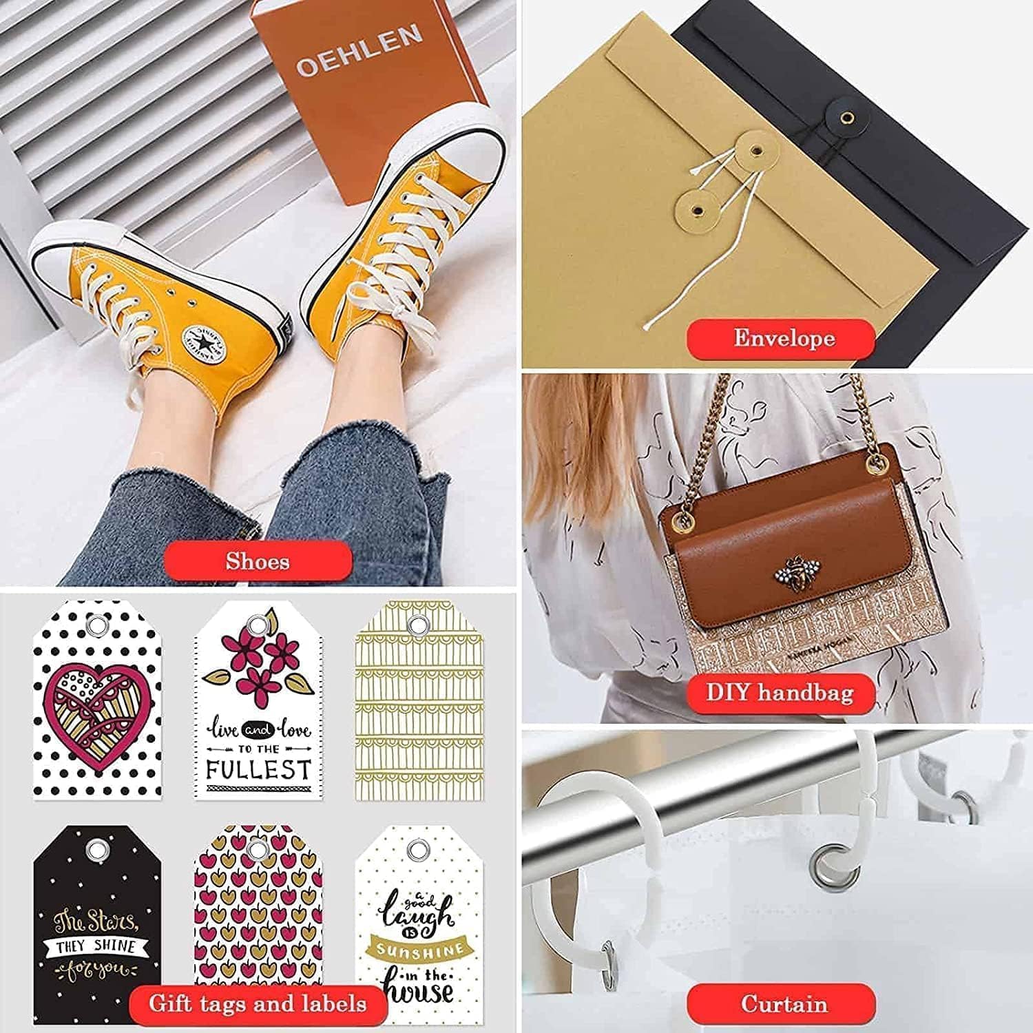 Intended Use – The metal grommets are light duty, more for decoration, can’t hold heavy pulling. This grommets kit is ideal for 1-3 mm thick materials like leather, tarps, shoes, elastic bands, paper cards, and hanging crafts. Not suitable for fabrics or cloth