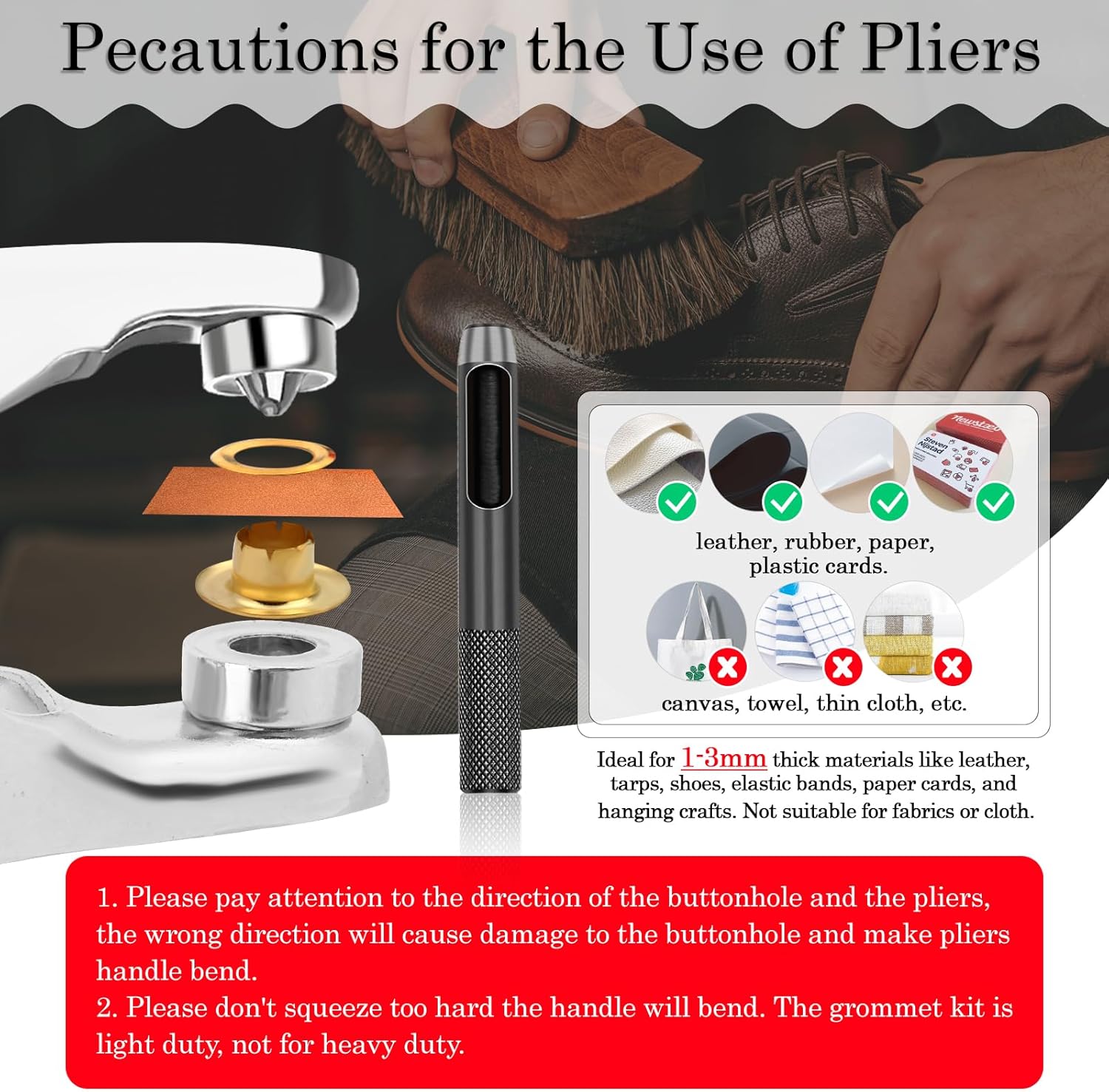 – Please pay attention to the direction of the buttonhole and the pliers, the wrong direction will cause damage to the buttonhole and make the pliers bend. Do not press too hard when using the pliers, the handle will bend. The grommet kit is light duty, not for heavy duty