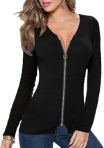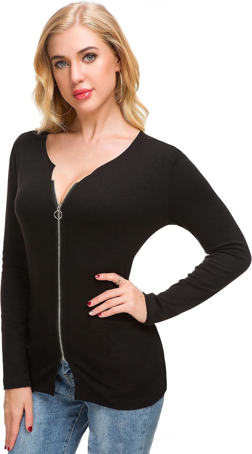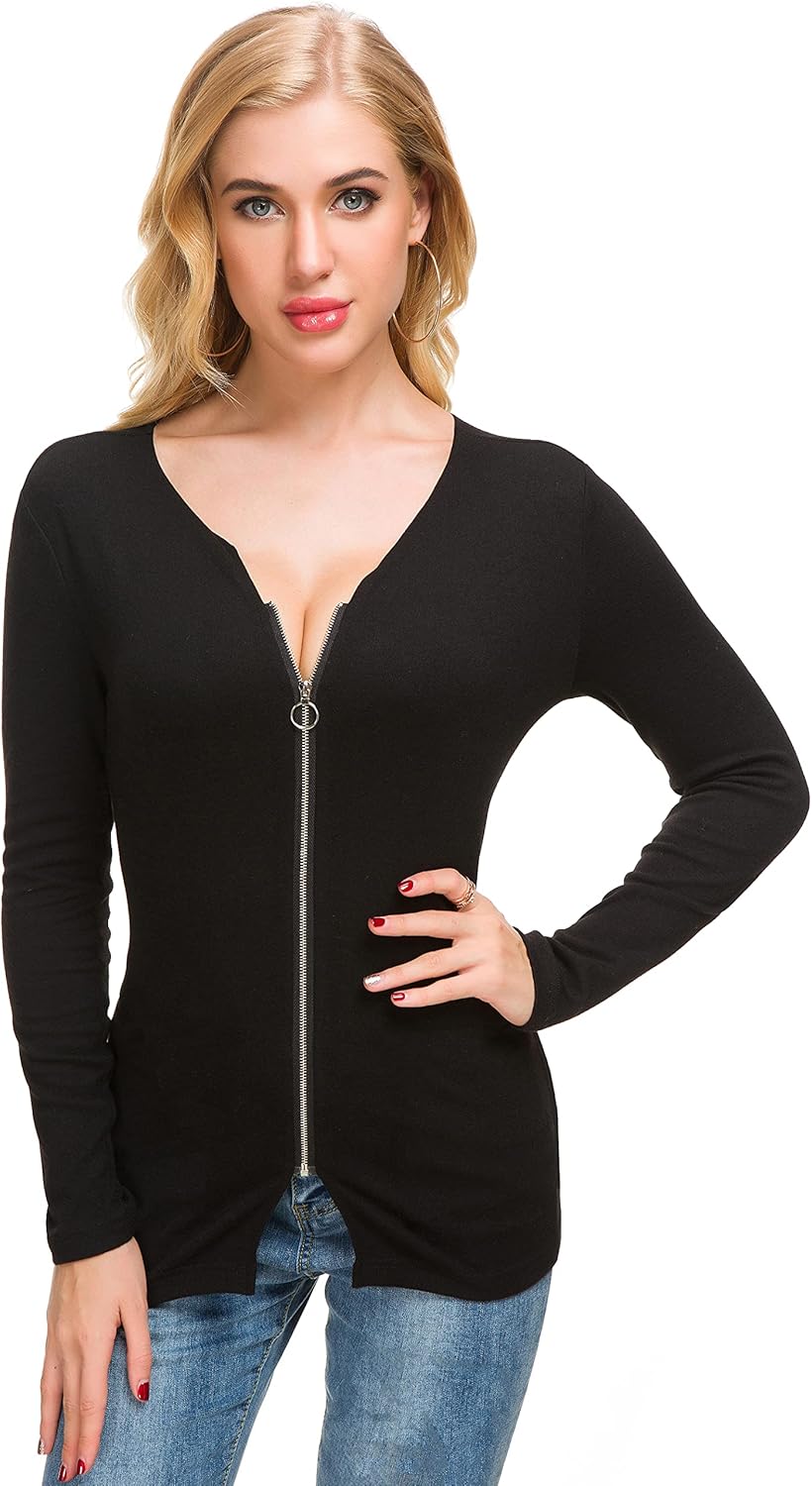 Afibi Women V Neck Zip Front Long Sleeve Casual Top Blouse Shirt/Cardigan