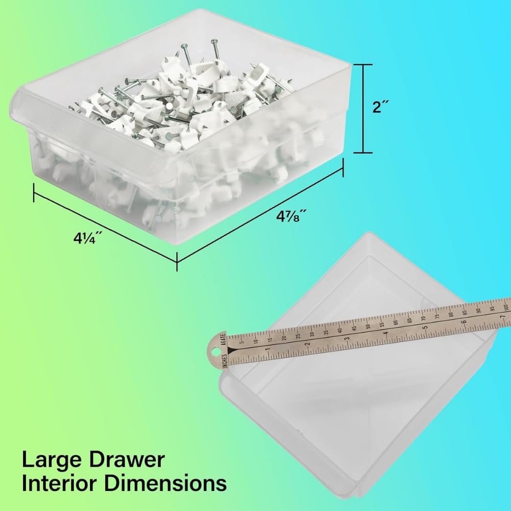 Versatile storage solutions for school, home, garage or office settings. These rugged plastic cabinets will organize and protect your small parts, toy bricks, office supplies, crafts, beads, hardware, fishing, classroom supplies and more. Cabinet stacks securely and has keyhole slots for hanging on a wall. Flexible, strong, see-through drawers feature finger grip drawer pulls. Large drawer inside dimensions: 4-7/8-Inch x 4-1/4-Inch x 2-Inch; small drawer inside dimensions: 5-1/4-Inch x 1-11/16-Inch x 1-1/2-Inch. Keyholes on back for hanging on walls and tabs on top and bottom for secure stacking. Cabinets have 8 small crosswise dividers and 4 large length dividers included. Included dividers are molded into the back of the cabinet (remove with scissors). Additional dividers are sold separately.