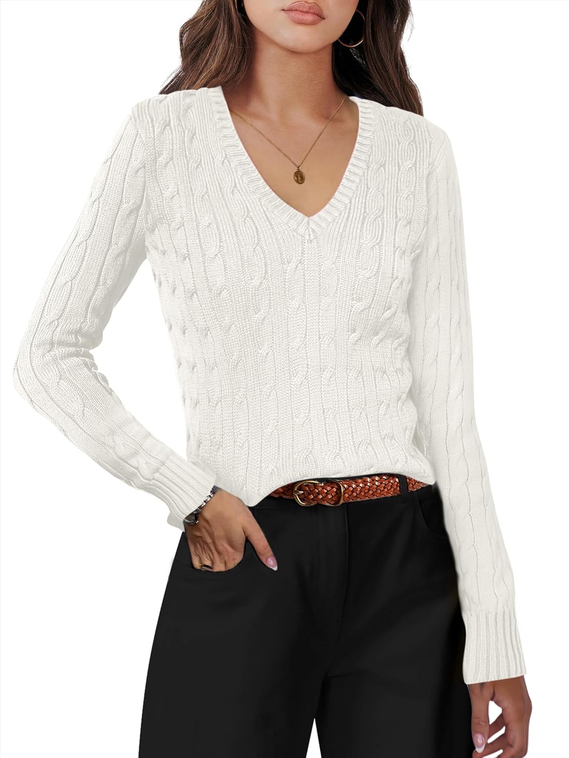 ANRABESS Women’s Long Sleeve V Neck Cable Knit Sweater Jumper 2025 Spring Pullover Top Cute Soft Ladies Dressy Casual Outfits