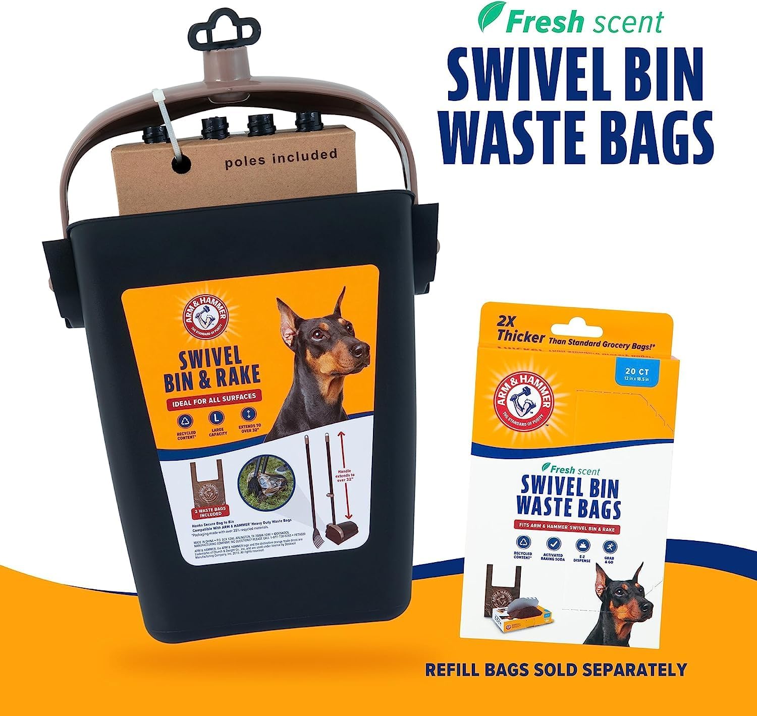The Arm & Hammer Dog Pooper Scooper Swivel Bin & Rake is great for those in need of effective dog and pet supplies. This poop scooper for dogs features a rake and swivel bin design that allows for efficient waste collection on any surface, great for use as a pooper scooper for large dogs or a pooper scooper for small dogs. The ergonomic handle extends up to 32 inches, providing comfort and ease when cleaning your yard without discomfort or strain. This pooper scooper offers a large capacity that is great for managing multiple pickups. Its construction is lightweight yet sturdy, providing reliability as a pooper scooper, while the compact design allows for easy storage. This product comes with two scented poop bags for dogs with activated baking soda for odor control and a fresh scent. The pooper scooper with bags makes it even easier to manage waste, providing a neat and clean solution. It is versatile across various terrains from grass to concrete. Designed for simplicity and practicality, these dog pooper scoopers stand out a great option for a pooper scooper. Whether for large or small dogs, the Arm & Hammer Pooper Scooper with Rake simplifies pet waste management, making it an essential dog accessory. A practical choice for maintaining cleanliness and hygiene, this dog poop scooper transforms waste collection into a simple task.