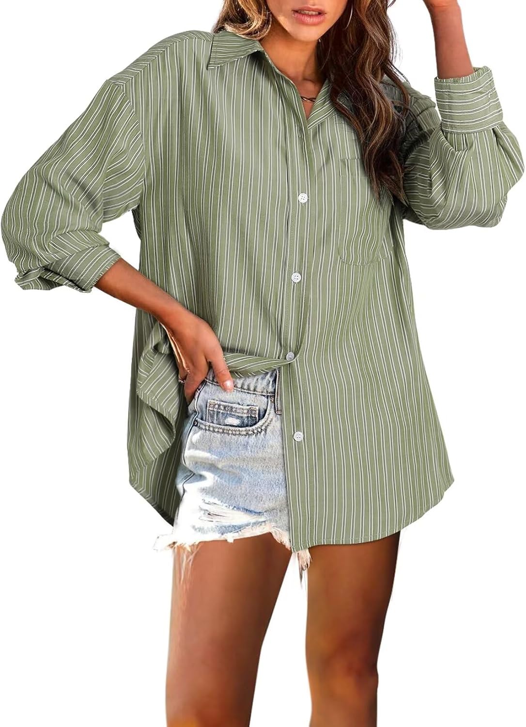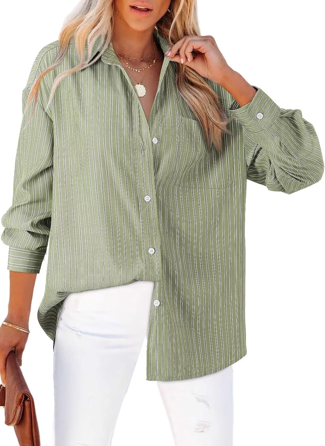 Astylish Women Blouses Oversized Striped Shirt Long Sleeve V Neck Button Down Work Tops