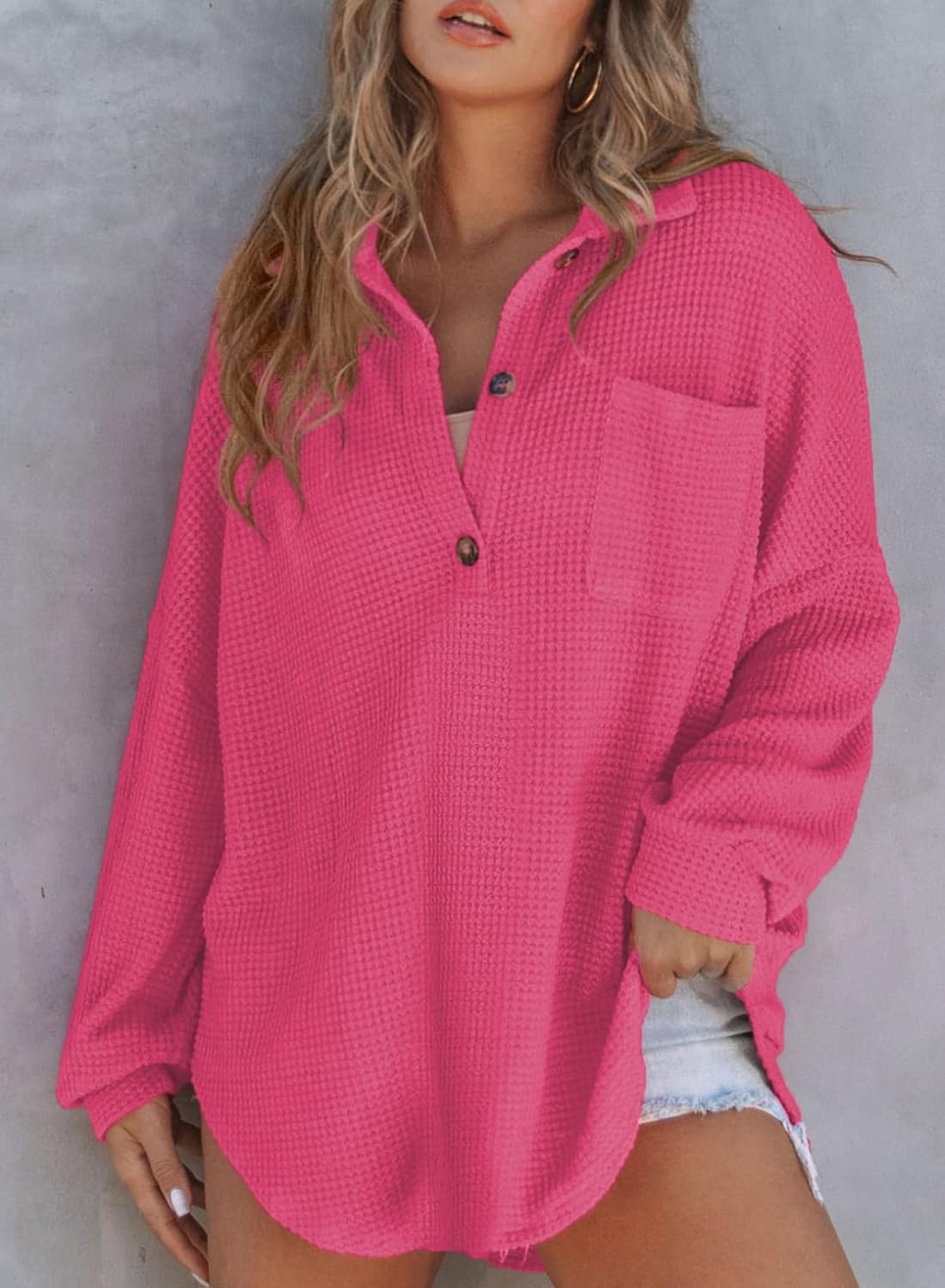 Customers find the waffle shirt’s color accurate to the picture and appreciate its comfort, with one noting the cozy waffle knit texture. The fit is nice and loose, and customers like its lightweight nature, particularly for early fall/autumn wear. Customers disagree on the material quality and thickness, with some finding it good while others describe it as cheap. The shirt is slightly see-through, and customers like its versatility, with one mentioning it’s perfect for lounging around the house.