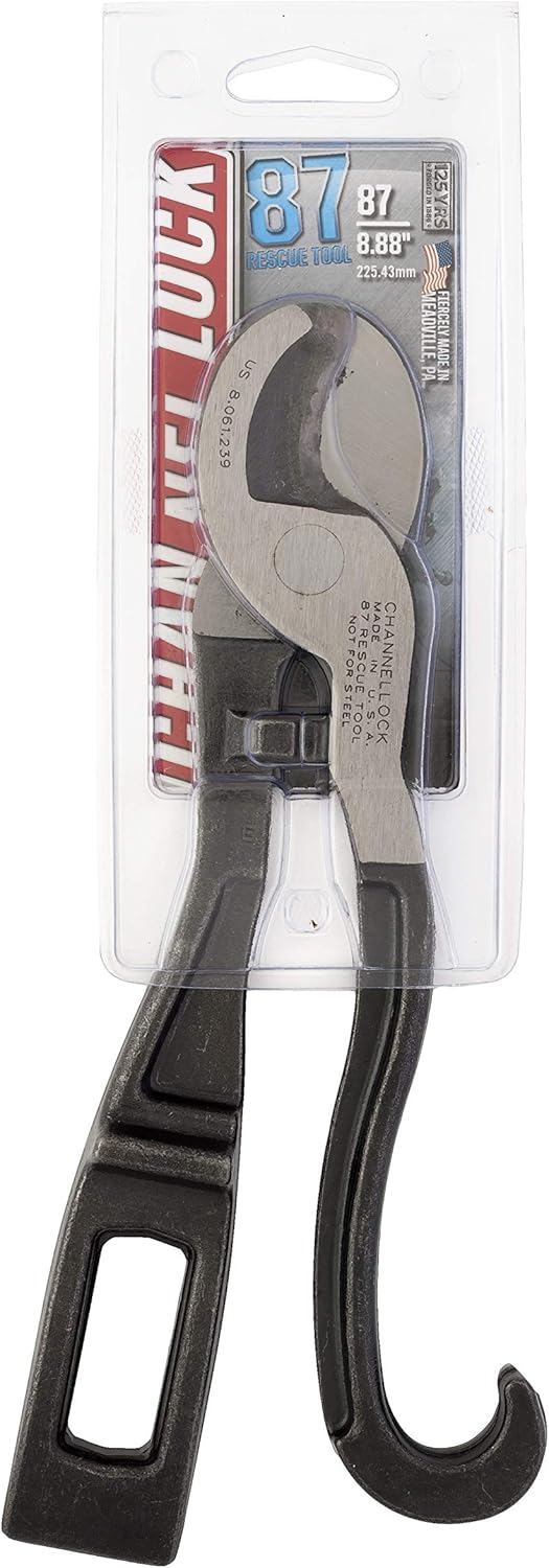 As a first responder, your job requires tools that are reliable and versatile. The CHANNELLOCK 87 8.88″ Rescue Tool pries open windows and doors, cuts wires and cables easily, shuts off gas safety valves and loosens hose couplings. Made from high alloy steel that is specially coated with the ultimate rust preventative. U.S. Patent No. 8,065,939.