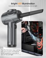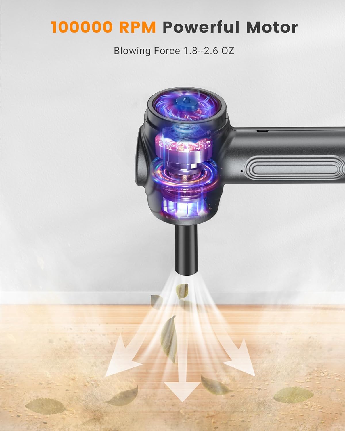 【100000 RPM High Speed Motor & LED】 High speed motor providing 1.9-2.6 oz of blowing power for deep dust cleaning. The bright LED lights help users identify and target areas that require cleaning with greater precision. The combination of air duster functionality and LED illumination makes the air blower suitable for various cleaning tasks both day and night.