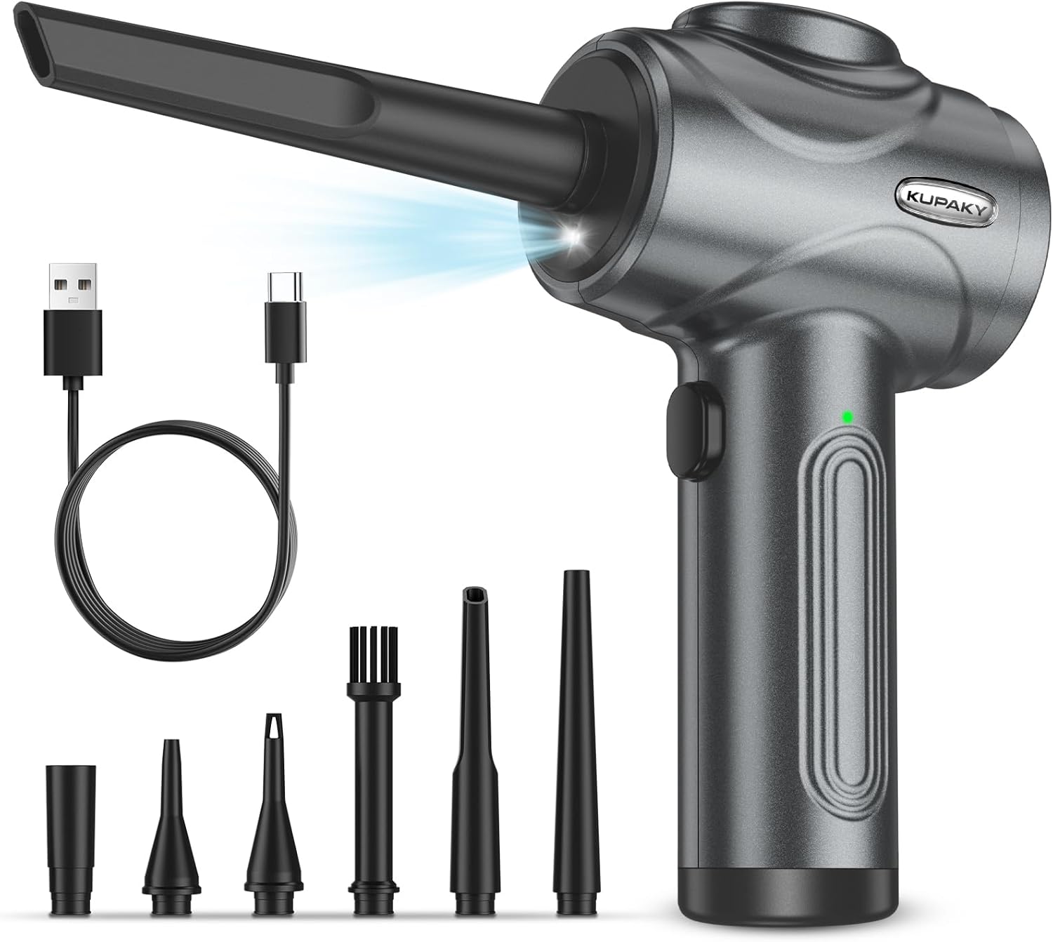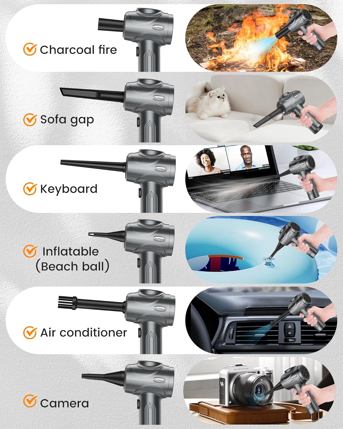 【6 Nozzles For Different Cleaning Propose】This KUPAKY air duster clears invisible dirt from the keyboard gaps, CPU, laptop, AC vents, blinds, sofa gaps, vehicle cup holders, and car seats easily, making the target items look refreshed. Its compact nozzle or attachment allows for targeted cleaning. This electric air blower can be used to inflatable products such as inflatable items.