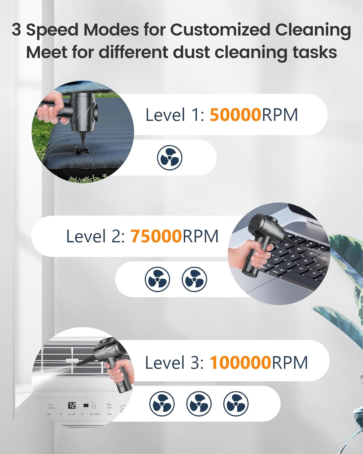 【3 Adjustable Speed Modes 】The electric air duster design with 3 adjustable wind speeds for providing you with customizable cleaning. The low-speed setting suitable for delicate electronics where a gentler airflow is required, while the high-speed setting can be used for more stubborn dust or larger surfaces.