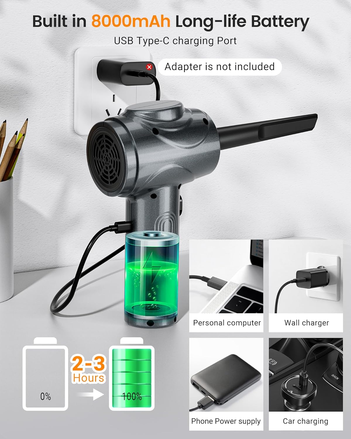 【8000mAh Battery & 2-3 Hours Fast Charging】The computer duster built-in battery ensures long-term continuous use. The cordless dust collector has a built-in 8000mAh battery, which can run continuously for up to 40 minutes. It takes 2-3 hours to fully charge the rechargeable air duster. The air duster can be charged by computer, mobile power supply, car charger, wall charger.
