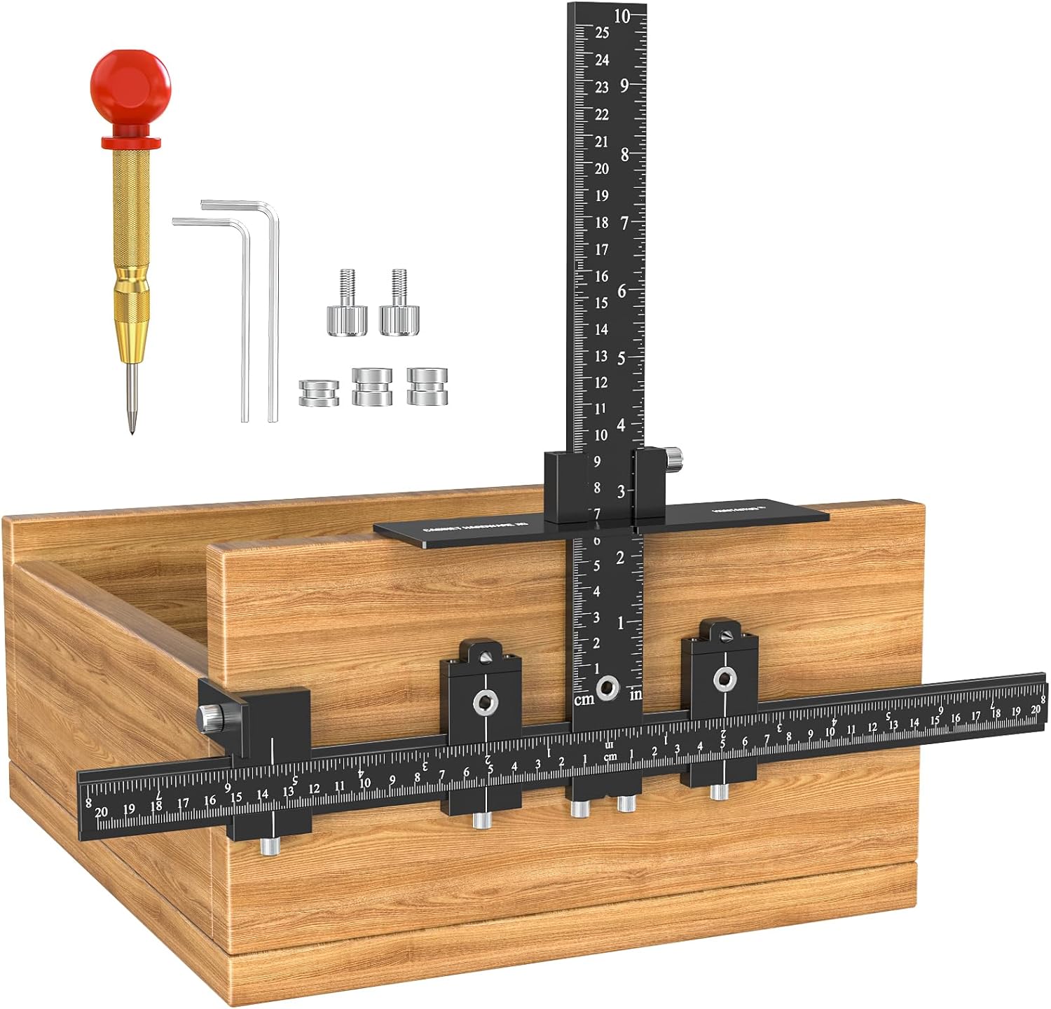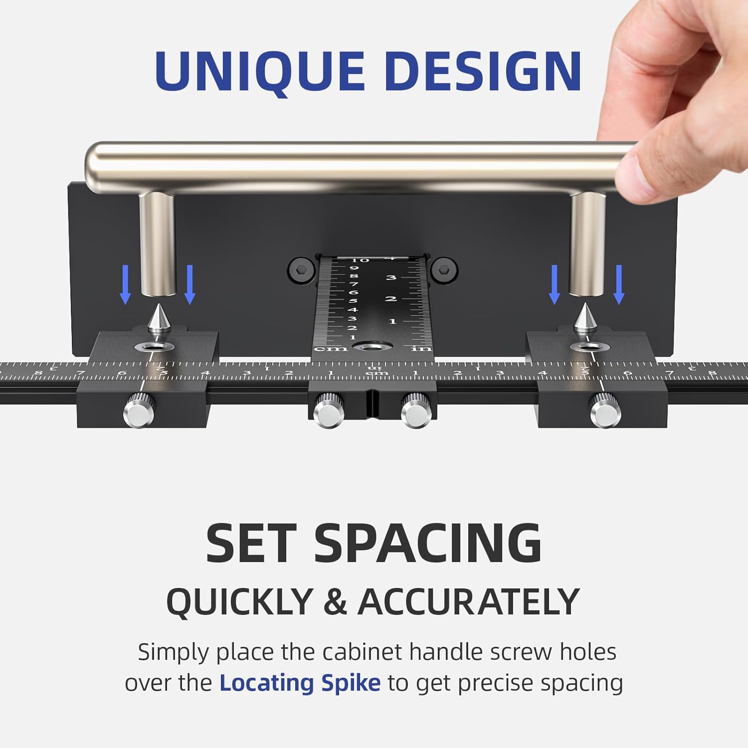 【UNIQUE DESIGN-LOCATES THE DISTANCE BETWEEN THE ENDS OF CABINET HANDLES IN 1 SECOND】We added a small conical metal spike about 0.5cm high on the two sliders of the cabinet hardware jig, which helps you to directly and quickly locate the ends’ length of the cabinet or drawer handles without measuring, to achieve quick positioning and punching, which will greatly improve your work efficiency.