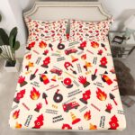 Fire Truck Fitted Sheet,Kids Cartoon Fire Engine Print Bedding Set 3Pcs,Boys Teens Bedroom Decor Firemen Firefighting Equipment Vehicles Bed Sheet Modern Orange Red Deep Pocket Sheet Queen Size