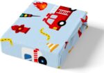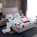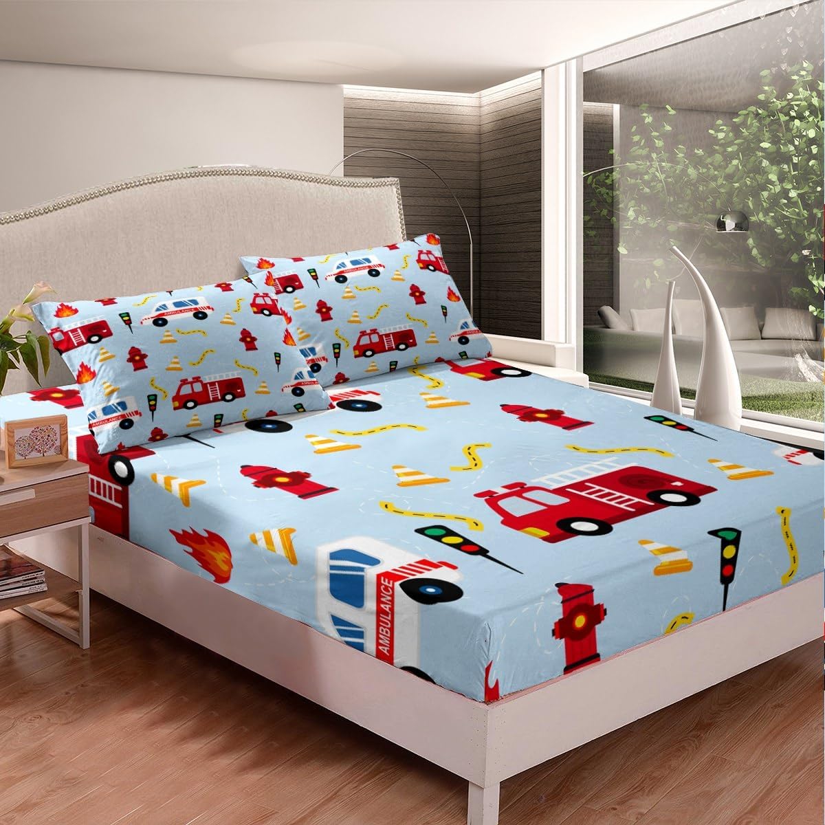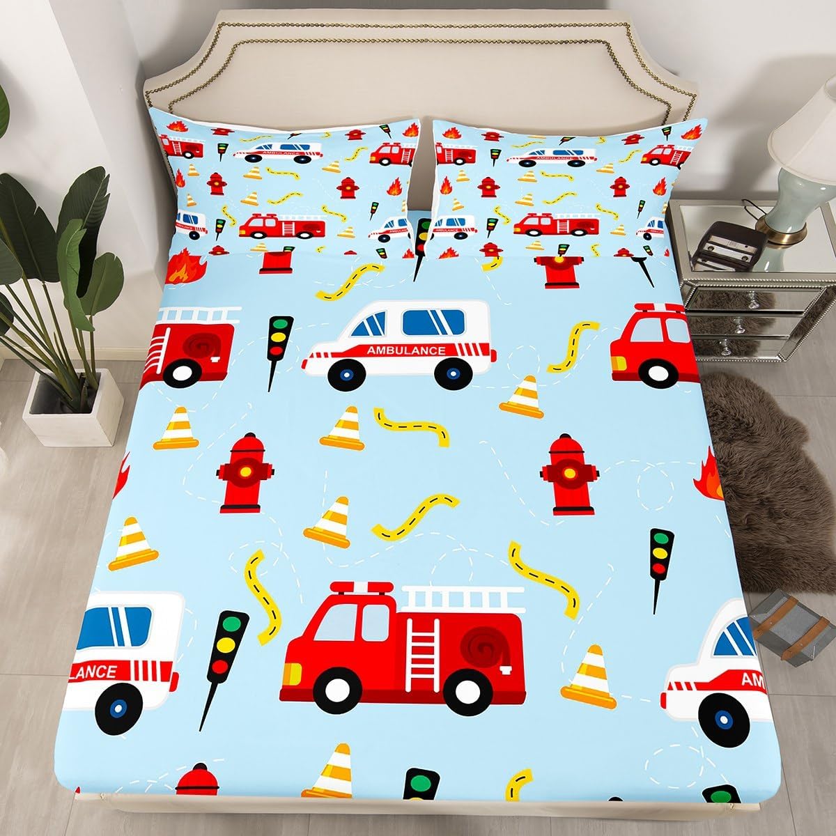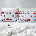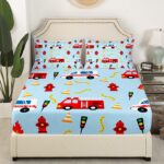 Fire Truck Sheet Set Full Size,Fire Fighting Equipment Red Fire Engine Bedding Set,Kids Boys Cartoon Car Traffic Light Bed Sheet Watercolor Blue Fitted + Flat Sheet Teens Child Room Decor 4Pcs