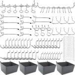 Package contains – 80pcs 13 different types of pegboard hooks, such as pegboard bins, peg locks, straight hooks, curved hooks, angled hooks, etc.