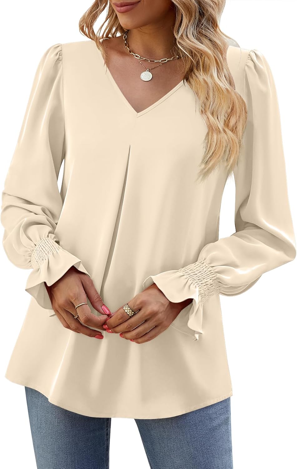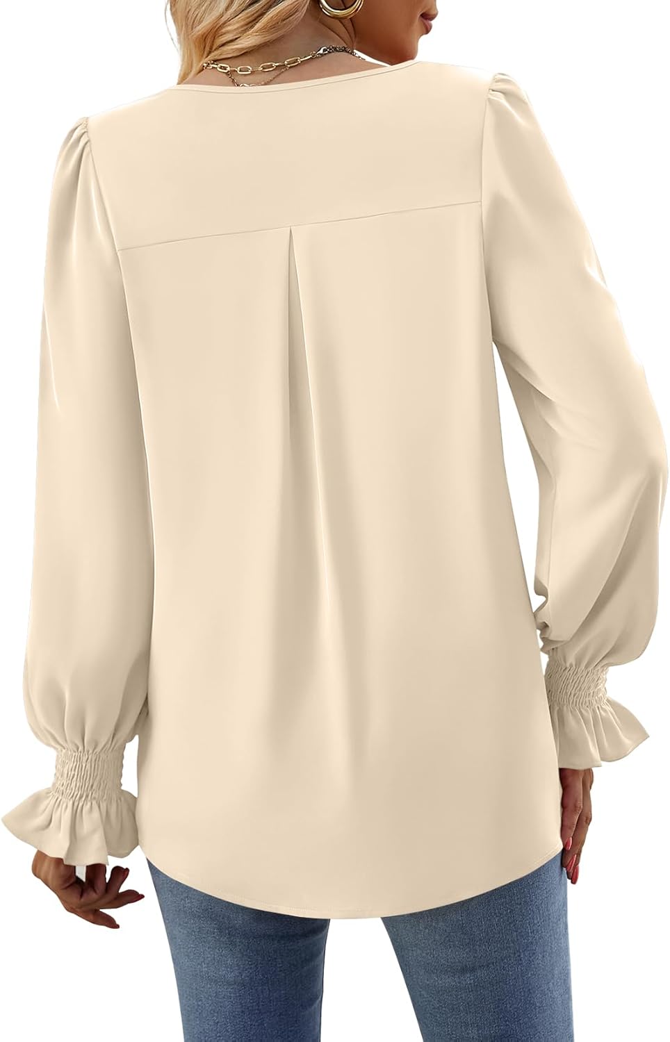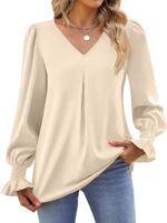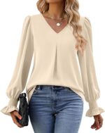 Funlingo Women 2024 Long Ruffle Sleeve Blouse Tops V Neck Smocked Cuffs Shirt