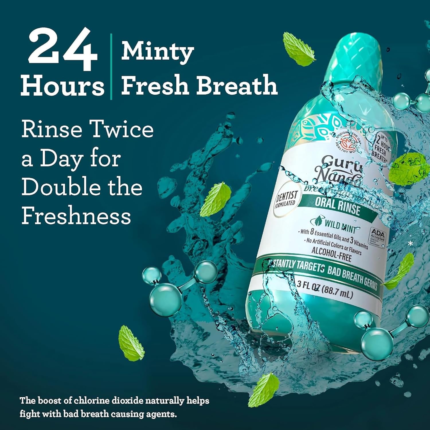 GuruNanda Fresh Breath Mouthwash, ADA-Accepted, Alcohol & Fluoride-Free, Sodium Chlorite, Essential Oils & Vitamins, 12-Hrs Fresh Breath, Wild Mint, 3 oz