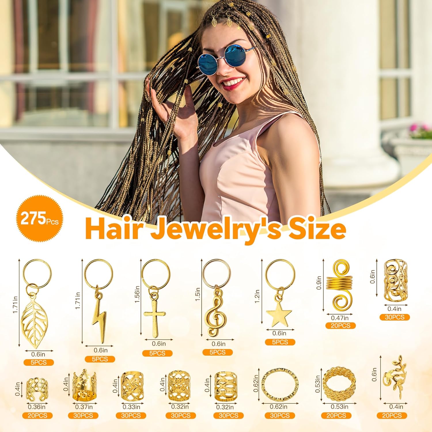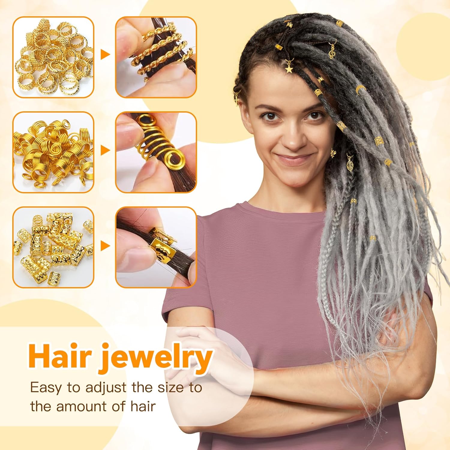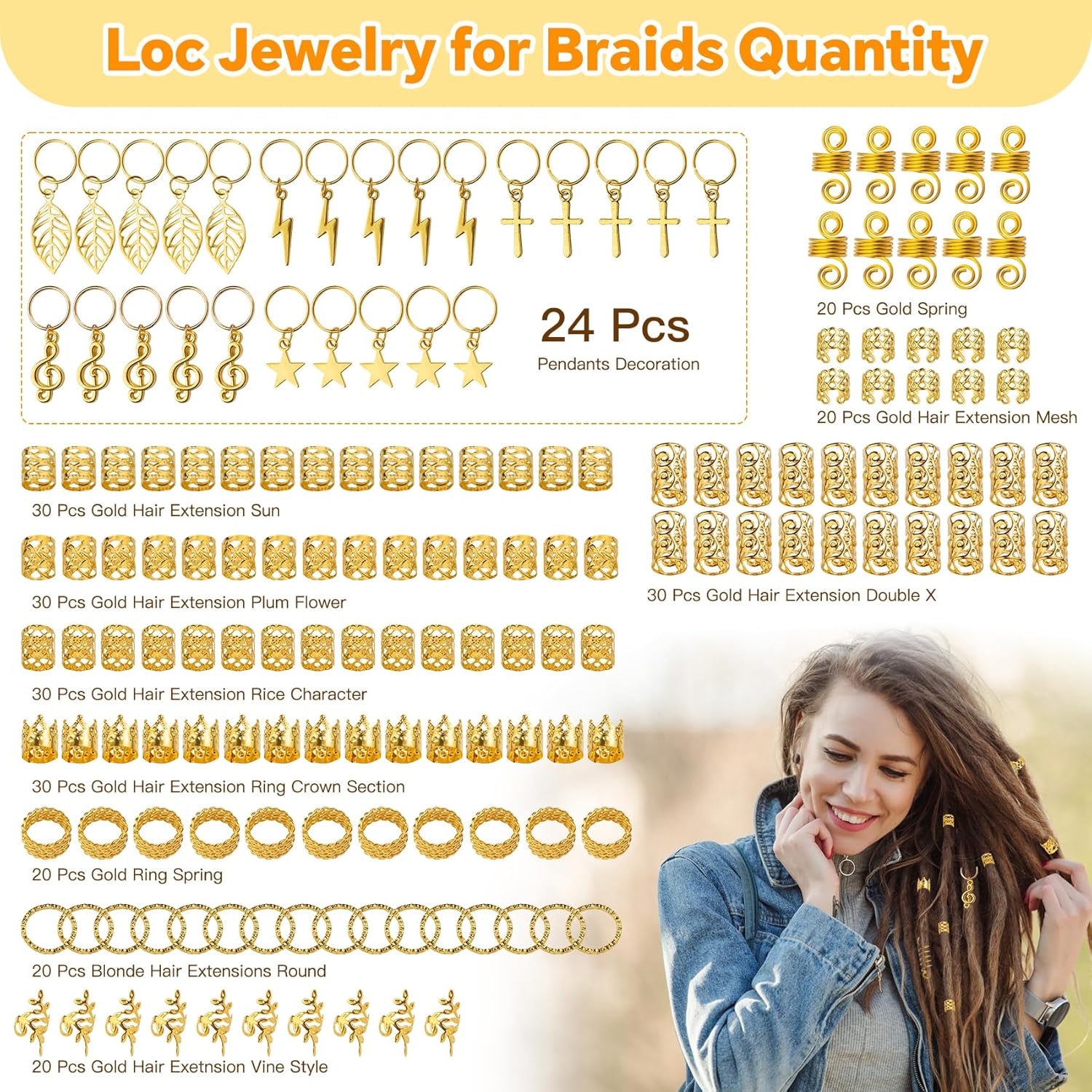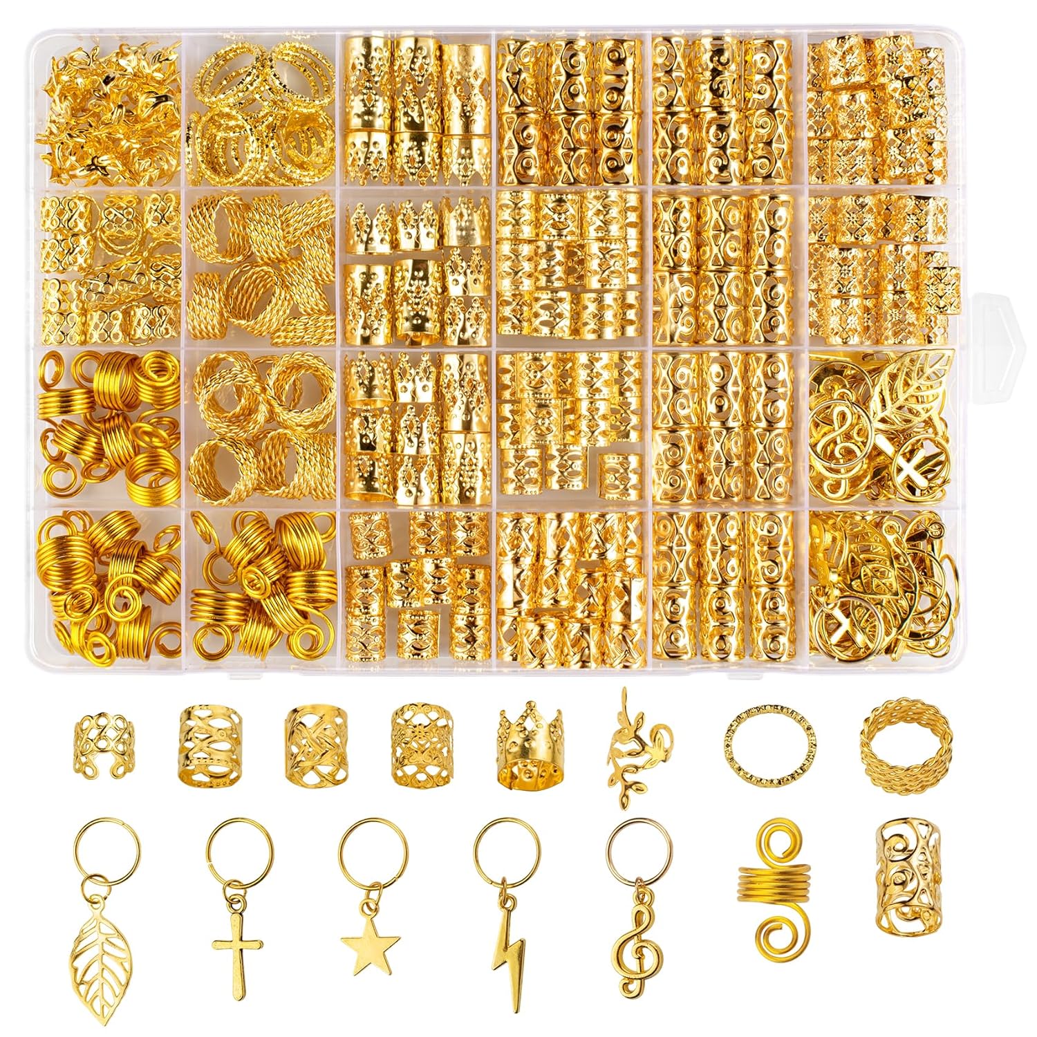 Various Styles: These dreadlock jewelry come in various styles and sizes, which can adjust the braiding beads according to your hair volume and your needs. 25 Pcs DIY hair braid ring pendants decoration, 30 x gold crown, 120 x gold hair braids in 4 styles, each of 30 pcs, 20 x gold spring, 20 x gold ring spring, 20 x gold hair extension round, 20 x hair extension vine style, 20 x gold hair extension mesh.