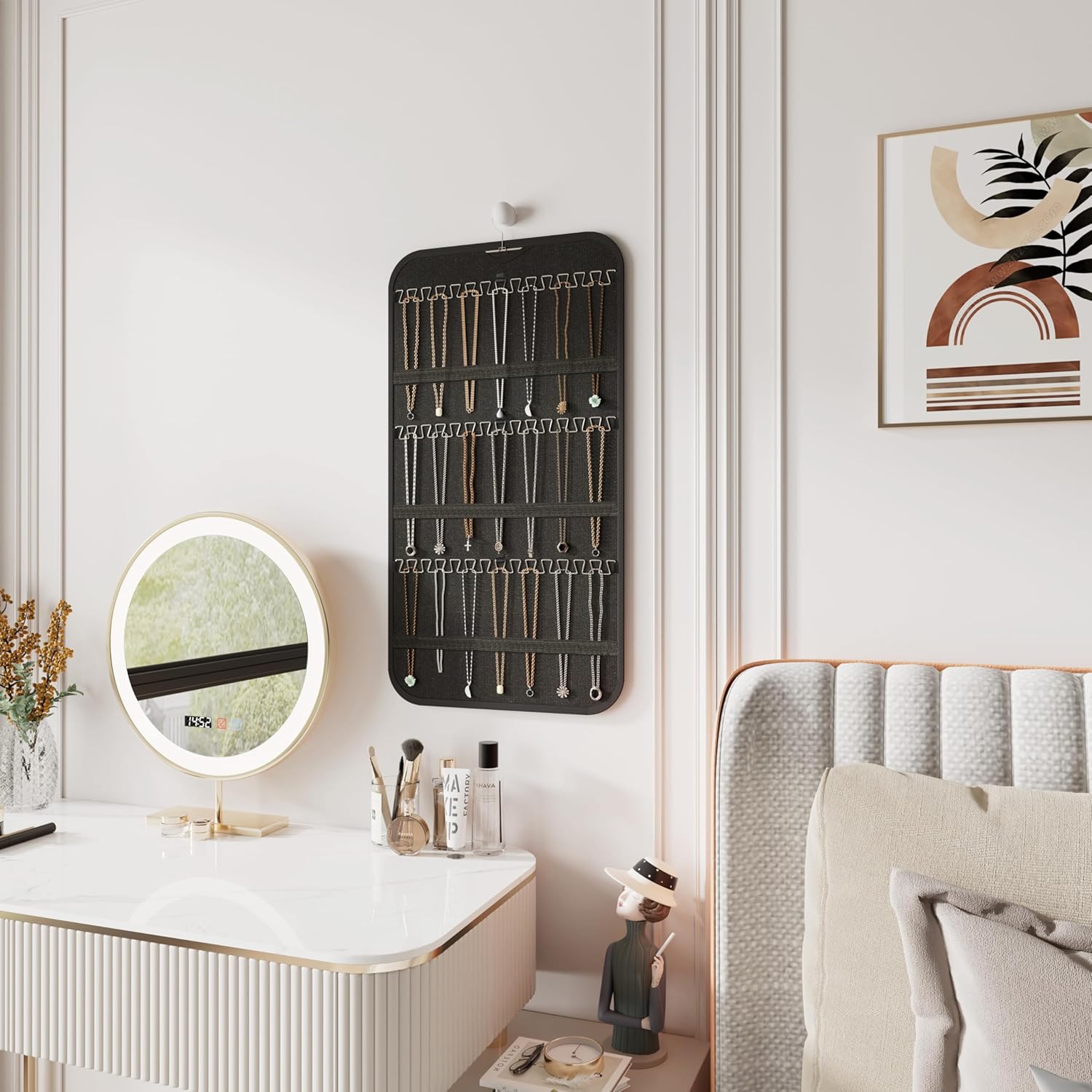 Exclusive Necklace Hooks: The jewelry hanger features 3 rows of sturdy, wave-shaped metal hooks capable of holding up to 42 necklaces. The unique design ensures easy retrieval and storage, with elastic straps preventing tangling