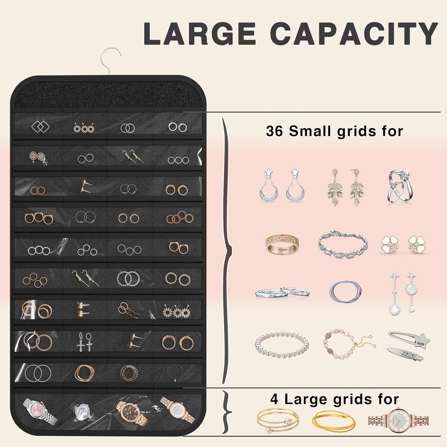 Ample Storage Capacity: This organizer includes 40 transparent pockets for rings, earrings, bracelets, watches, long with 36 necklace hooks, offering generous space for all your jewelry pieces