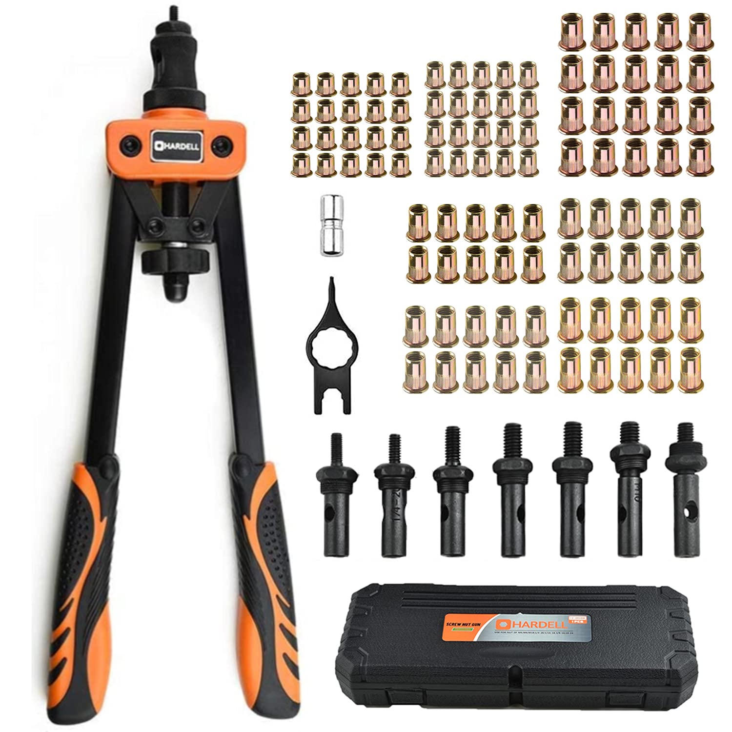 HARDELL Rivet Nuts Tool, 14″ Hand Rivet Tool Kits with 100Pcs Rivet Nuts and 7 Metric & Inch Mandrels M6 M8 M10, 1/4-20, 5/16-18, 3/8-16, 10-24 and Rugged Carrying Case