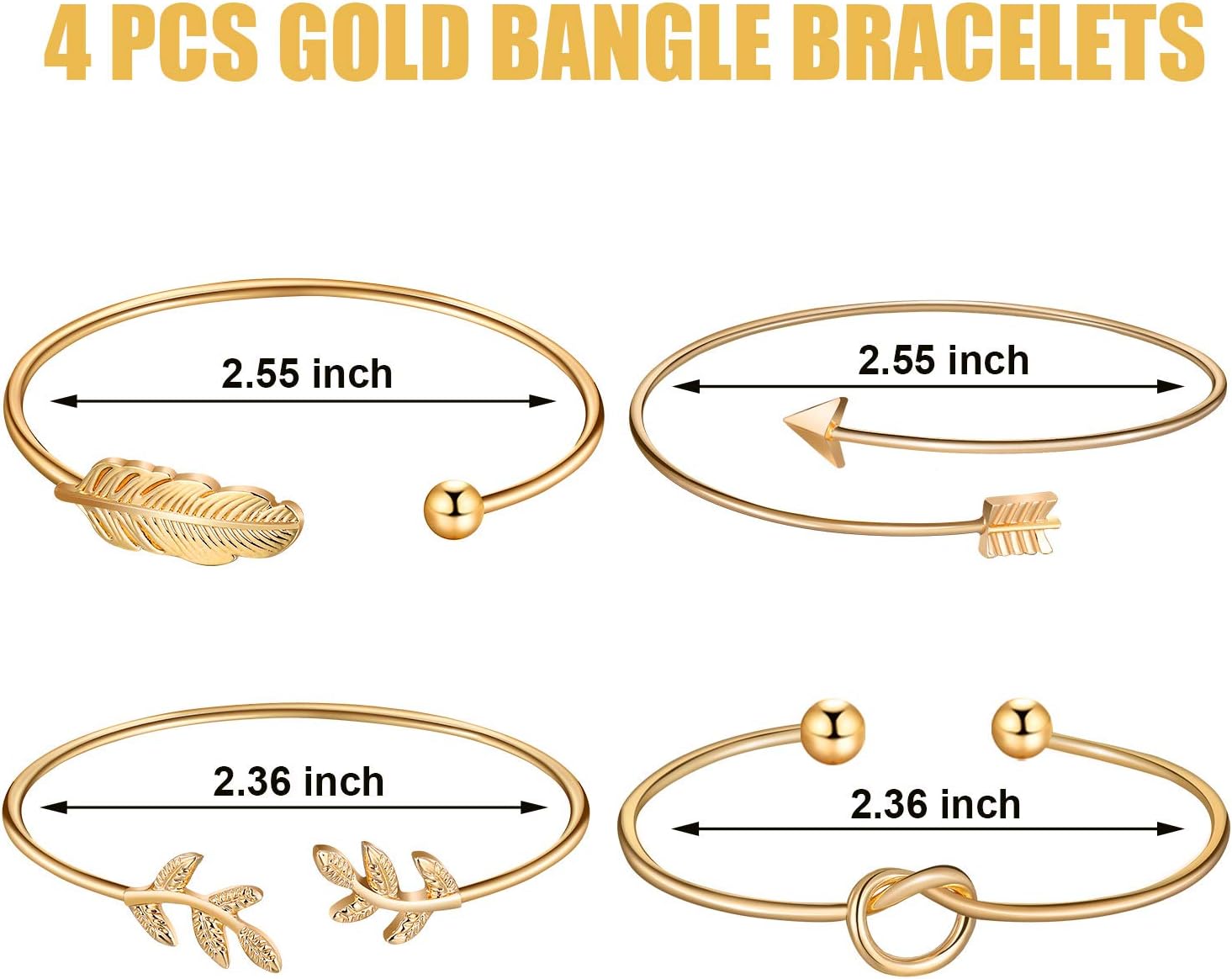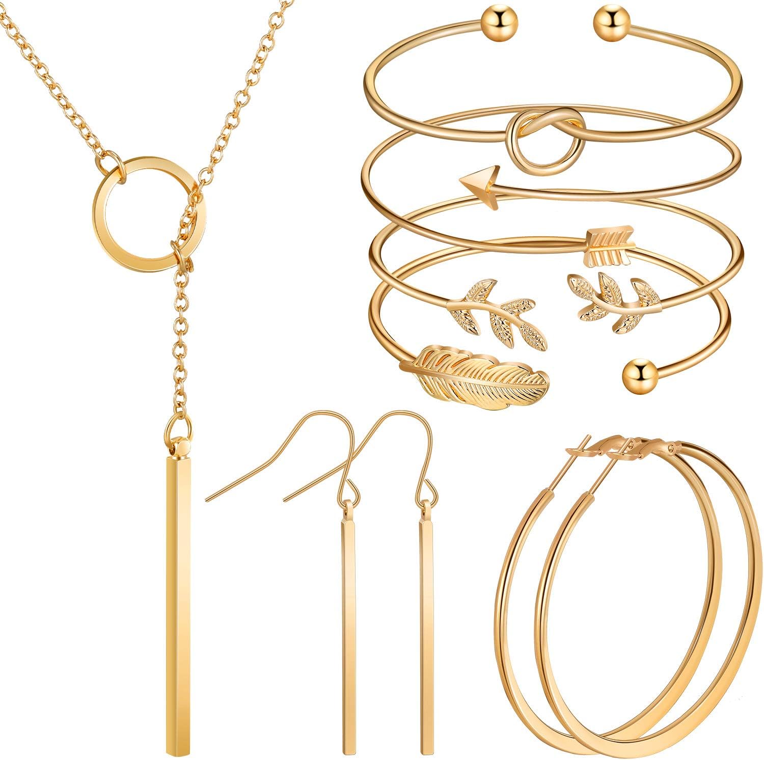 The bracelets have 4 different dainty designs, arrow, olive leaf, feather and knot heart, the necklace fixed the bar into the circle, also combined with square geometric stick drop earrings or hoop earrings, simple design but not out of date easily, with classic color matching, elegant and delicate.