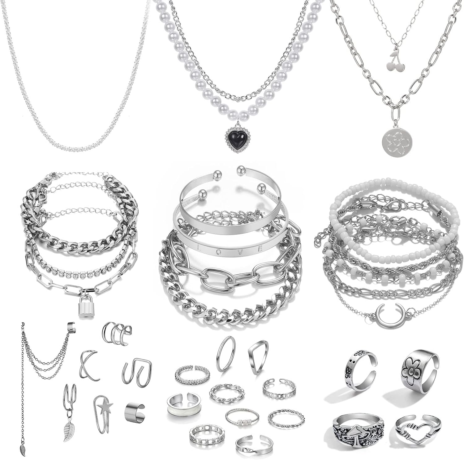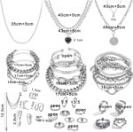 IFKM 36 PC Silver Plated Jewelry Set With 3 Necklace, 12 Bracelet, 7 Ear Cuffs Earring, 14 Knuckle Rings For Women Girls Valentine Anniversary Birthday Friendship Gift