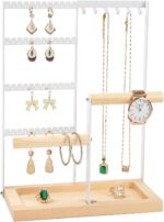 • 4 Tier Jewelry holder include 2 bars bracelets wood stands hold and 48 earrings holes, 6 Hooks necklace organizer, with a wood tray that provides. Necklace stand prevent tangling and knots, saving your time; Preserves and extends your jewelries’ longevity
