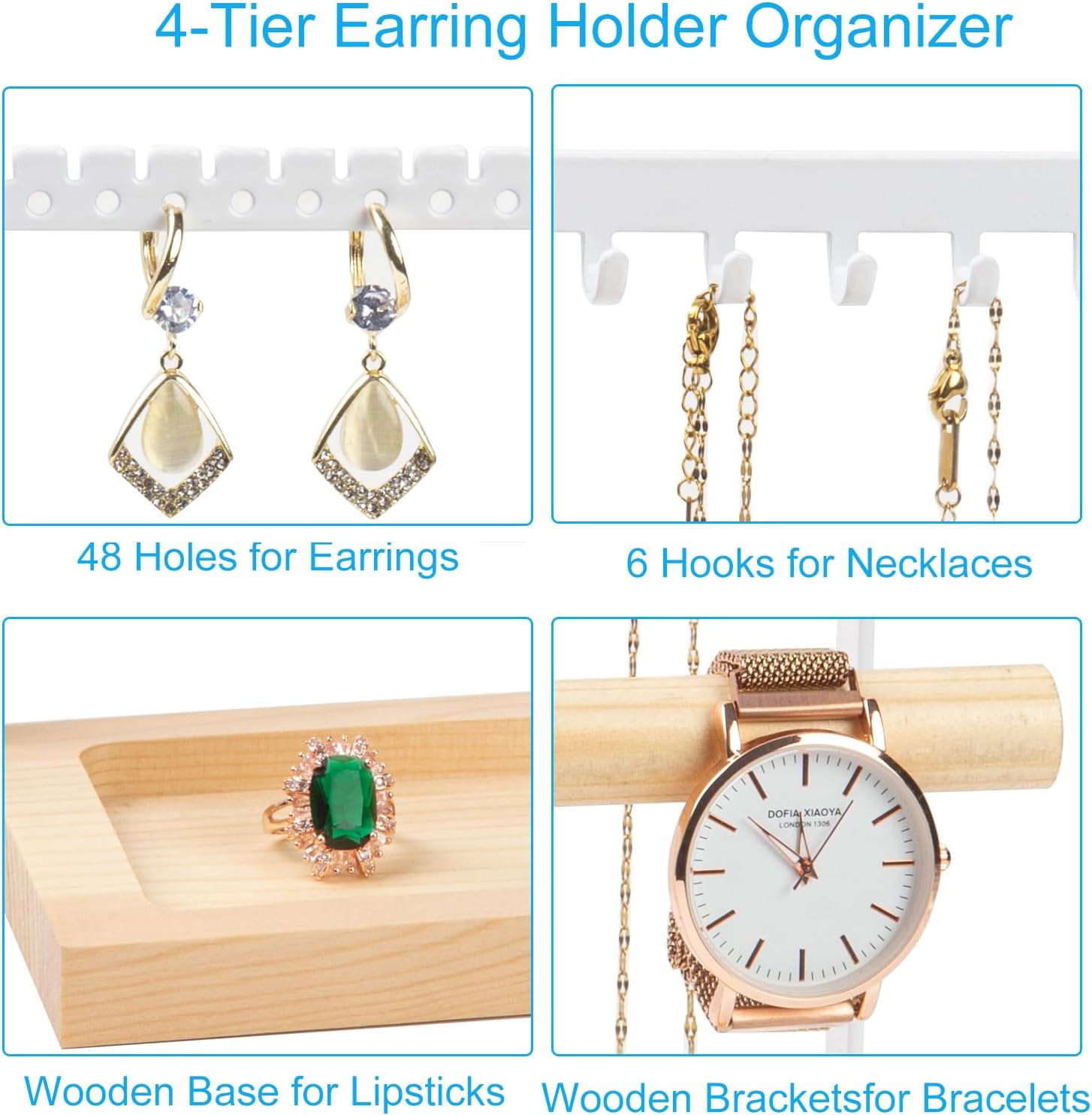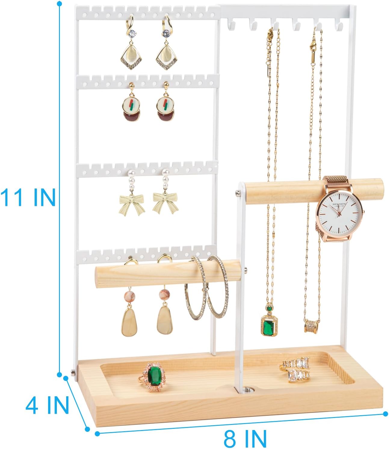 Large Storage More Jewelry: Dimensions: 11.0 X 8 X 4.0 IN, 4 Tier Jewelry holder include 2 bars bracelets wood stands hold and 48 earrings holes, 6 Hooks necklace organizer, with a wood tray that provides enough space to hang necklaces, bracelets, anklets, headbands, hair ties, scrunchies, rings, watches, jewelry and earring display stands for selling