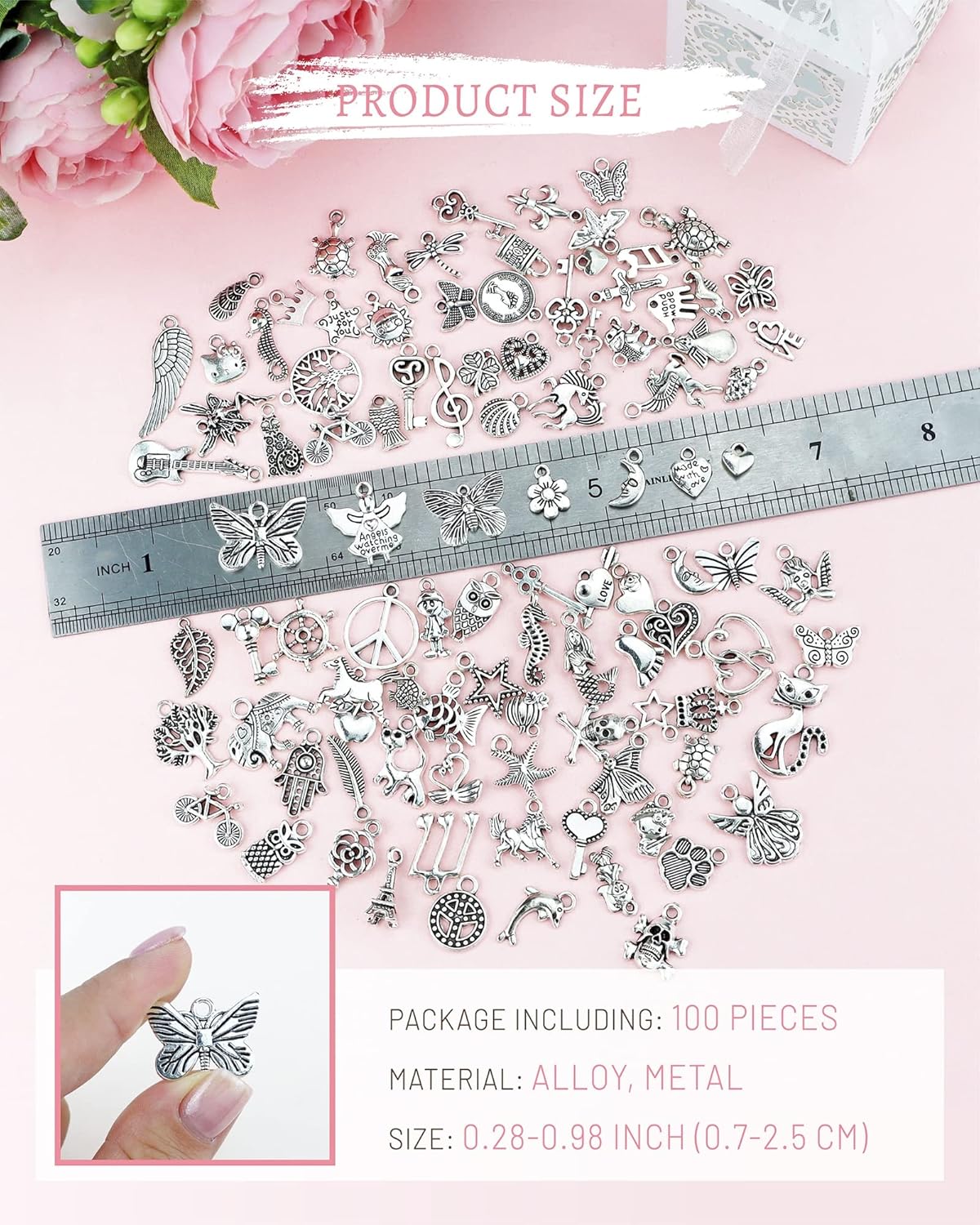 Material: Alloy, lead and nickel free. 100% brand new and high quality. – 30 mm).Color: antique silver. Size: 0.3 – 1 inch (7-25 mm). Quantity: 100 pcs jewelry making charms. 1 pcs chamois cloth of JIALEEY. (Great for cleaning and polishing jewelry).Tibetan silver metal charm, it’s fashion, creative, full of special means, is a very useful accessory, Exquisite and classical design charms. It can be used in all kinds of decoration.Perfect for handcraft works, zipper pulls, earring, necklace, bracelet, keychain, sweater chain, anklet, cellphone decoration accessories, etc. Best choice for jewelry DIY.