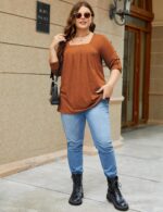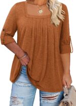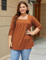 Sleeves of plus size fall tops roll up nicely and attach with a button, easily convertible to and from 3/4 length or full length sleeves. Square neck of plus size 3/4 sleeves tops is restrained enough that you likely will not need to be fighting with your bra straps to keep them from being exposed.