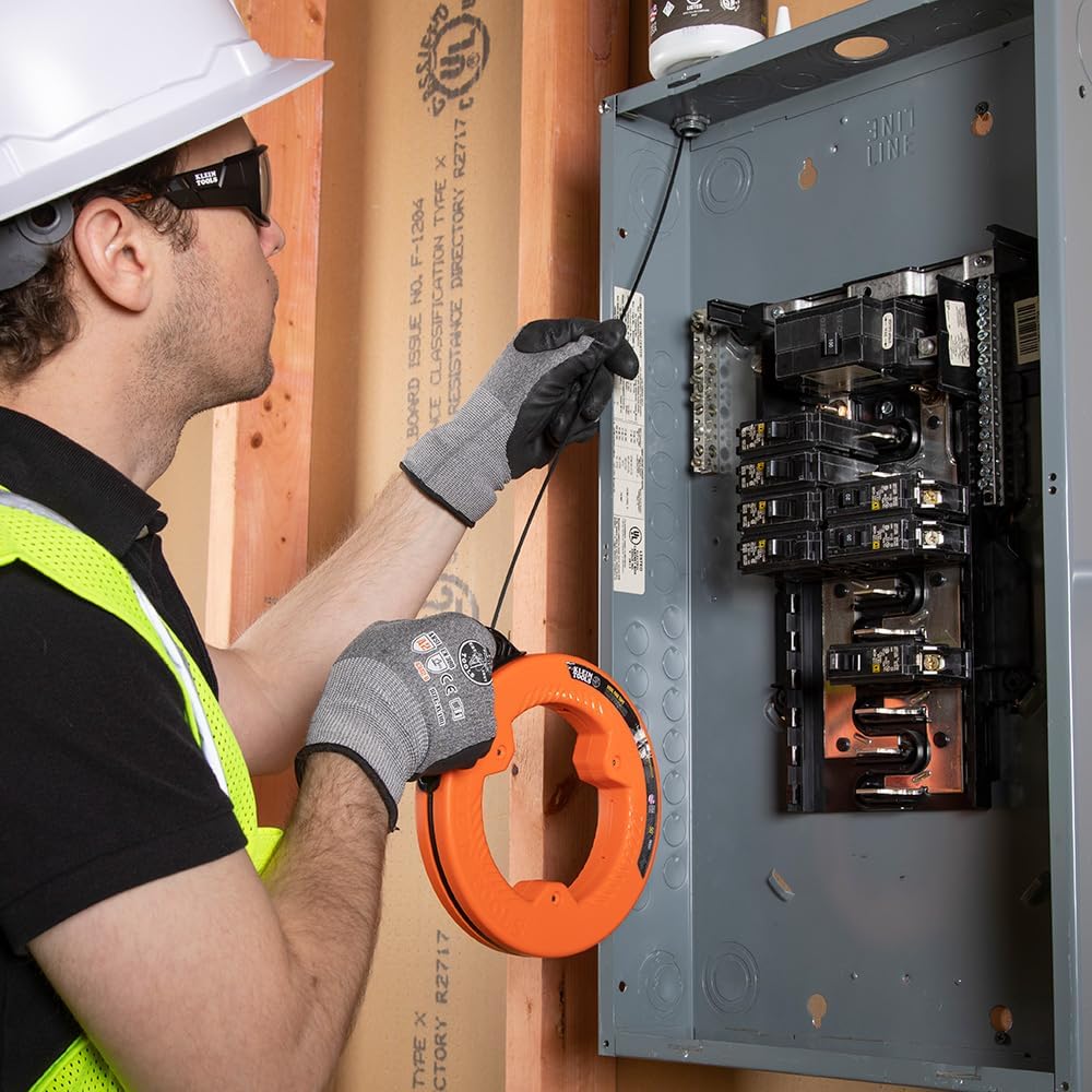 The Klein Tools’ 50-Foot Steel Fish Tape is perfect for wire runs associated with light commercial, residential and voice-data-video installations. The optimized housing and handle design decreases payout effort and reduces binding. The large handle allows for a firm, steady grip as you pull the tape from the housing. The tape features laser-etched descending markings placed at every foot. These markings allow you to accurately measure the depth of conduit runs and determine the amount of tape left to pay out.