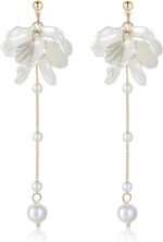 Kruckel Pearl Flower Long Drop Dangling Earrings – Cute Sparkly Golden Stud Lightweight Women Jewelry, White Petal Dangles, Easy – Wear Fashion Design Accessory with Durable Jewelry Box