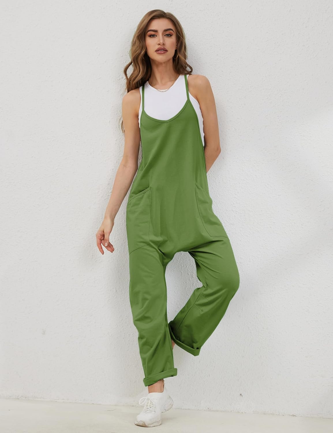 Lentta Women’s Causal Jumpsuits V Neck Sleeveless Harem Overalls Stretchy Adjustable Strap Romper with Pockets