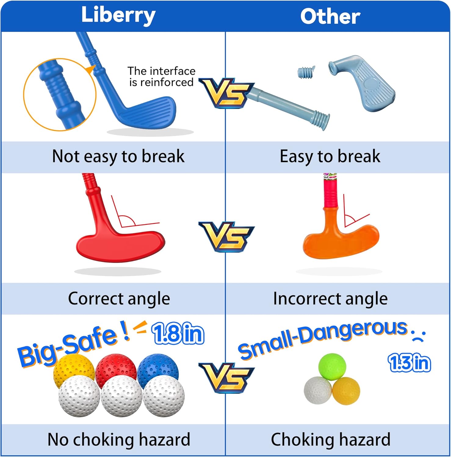 Safe and Durable: The latest version of Liberry’s kids’ golf set is produced with odorless, non-toxic and high-quality plastic. The toddler golf set does not include any parts or edges that are jagged or pointed. The hardness of the club is enhanced, and it is not easy to break. Because our golf balls are larger (1.8 inches in diameter), it can effectively avoid choking hazards