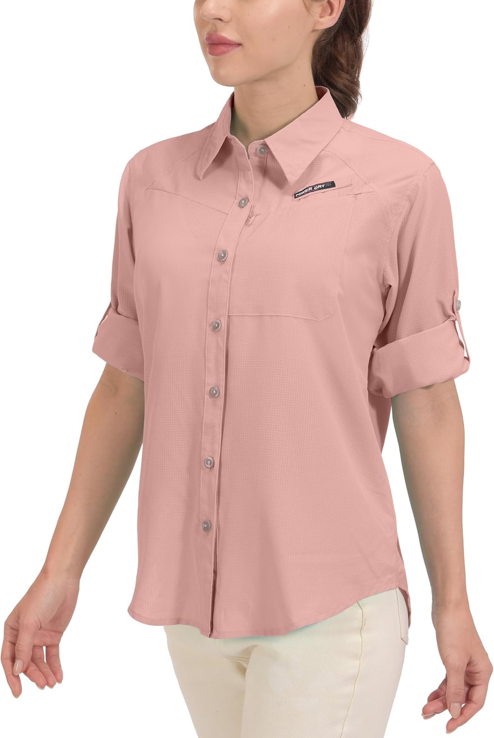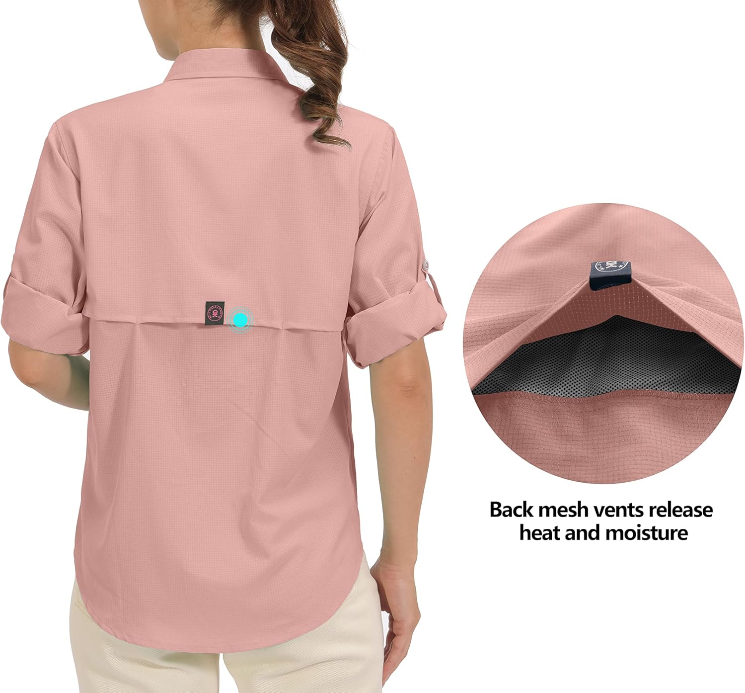 COOLING – Mesh lining on back sweat-prone area, open back mesh vents let in and out a cooling breeze, perfect in hot, humid weather. Rolled-up sleeves secure with loops and button tabs, and convert to a short sleeve.