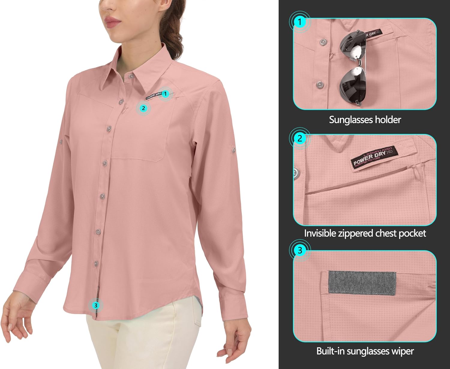 OTHER FEATURES: One invisible zippered chest pocket; One sunglasses holder; Built-in sunglasses wiper; Convert to short sleeve with loops and button taps. Ideal for hiking, fishing and daily wear.