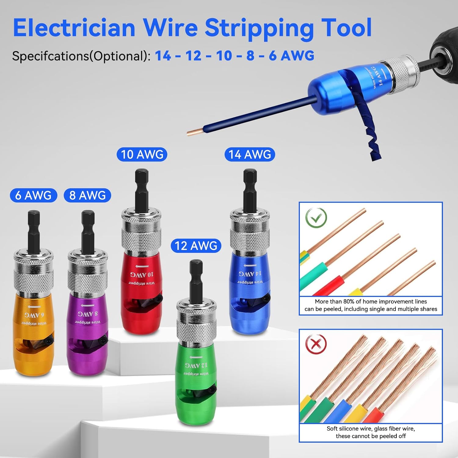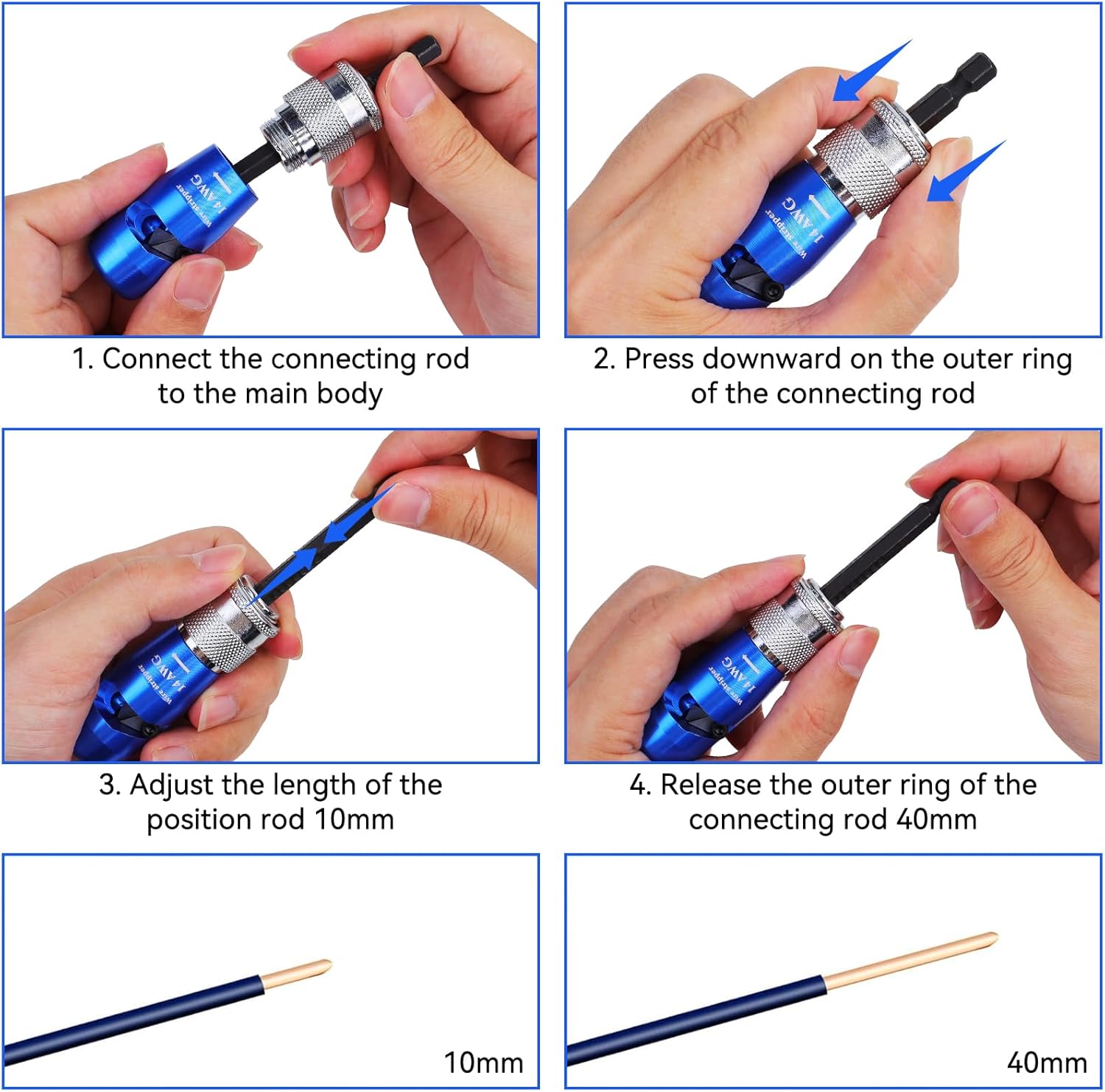 [Wire Stripper for Drill] – Compare to the tranditional manual work, 2025 new drill wire stripper tool can be combined with a hand electric drill or other electric tools to achieve quick and efficient wire stripping. Makerfire drill wire stripperr is fit for 14AWG, 12AWG, 10AWG, 8AWG,6AWG solid core wires insulation. The wire stripper for drill features an adjustable connecting rod (0.4-1.6inch), providing flexibility and precision for a variety of wire stripping tasks.