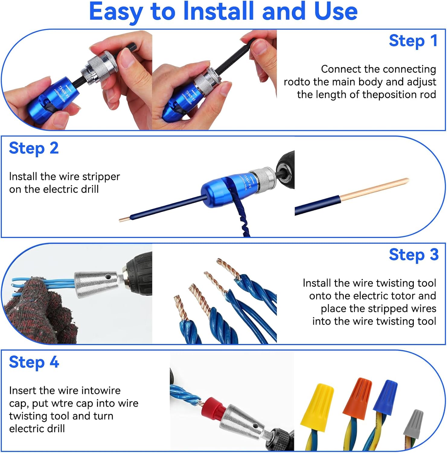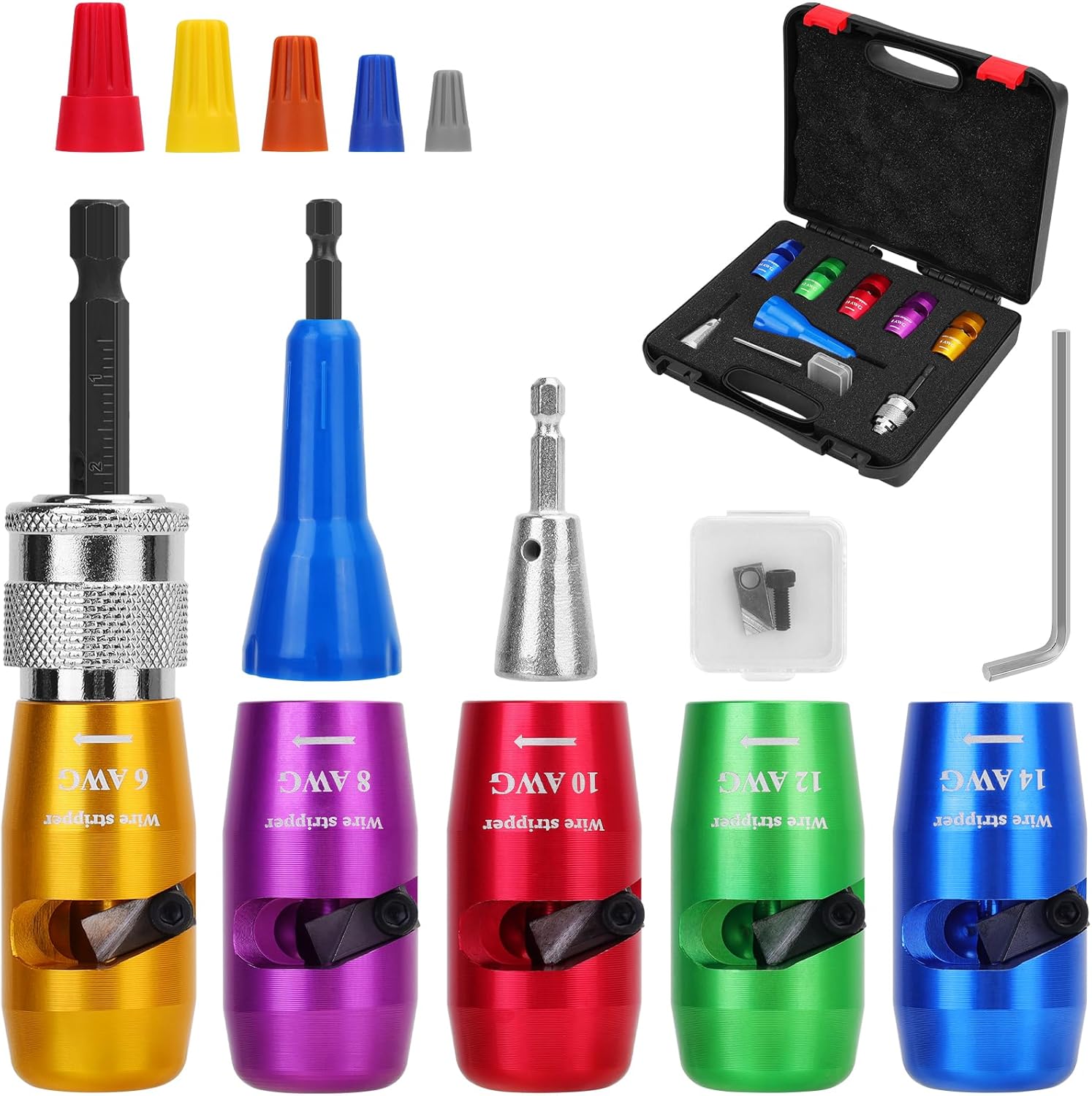 [Drill Wire Stripper and Twister Kit] – Makerfire wire tools of the latest full set of electrician’s tool kit, Including drill wire stripper * 5, Wire twisting tool * 2, Wire caps * 5, Wire stripper connecting rod * 1, Replacement blade * 1, L-shaped hexagonal wrench * 1, Instruction sheet * 1, Storage Box*1, Complete set to meet the stripping, paralleling, insulating and other work content, easier and quicker than the old-fashioned manual Wire stripper is more convenient and faster, using this electrician tool set will fast improve your work efficiency.