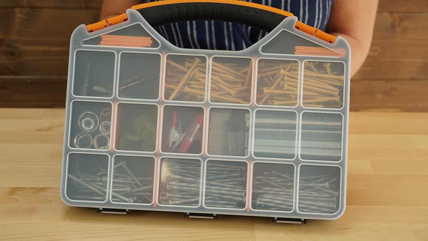 Be it 18 individual compartments for small nuts, bolts, and or longer, wider sections for handheld tools like screwdrivers this multipurpose hardware box can be used to store and organize all types of different items. And because the removable dividers can be placed in tons of different configurations, it’s perfect for hobbyists, crafters, and hands-on professionals alike.