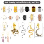 What You will Get: Package includes 121 pieces of Mix Styles Braid Hair Jewelry with a clear Storage Box.18x DIY Hair Braid Ring Pendants Decorations (2x Crystal Wire Wrapped Pendant , 2x Egyptian Wedjat Eye of Horus Ra, 2x Moon, 2x Snake, 10x Pearl);15x Hollow Polish Cylindrical Beads(Golden&Silver&Black);10x Spring Shape Hair Coil (Golden Silver);10x Imitation Wood Hair Tube Beads(Mixed patterns and size);20x Gold Hoop Rings;48x Large Dreadlocks Cuffs(Gold &Silver).