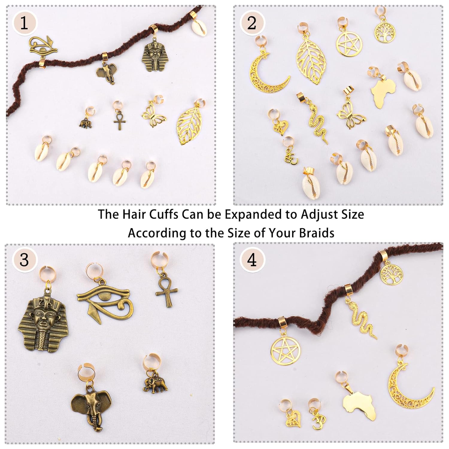 Package include: there are total 20 pieces hair Jewelry for women braids, include 15 different shapes, such as snake, butterfly, elephant, tree, shell, cross, moon, eyes, Egyptian pharaoh, leaves, map, heart and so on, plenty of braiding hair charms can meet your needs for decorating your hair, suitable for party and wedding prom etc.