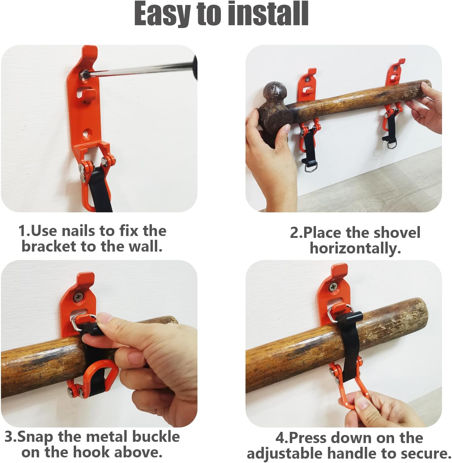 【Easy to install and use】The step of the install: 1.Use nails to fix the bracket to the wall. 2.Place the shovel horizontally. 3.Snap the metal buckle on the hook above. 4.Press down on the adjustable handle to secure.
