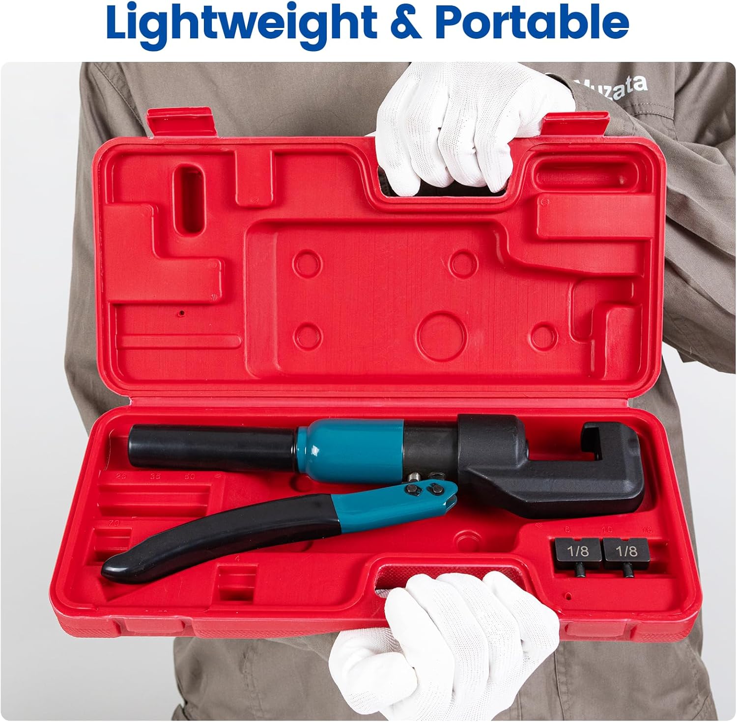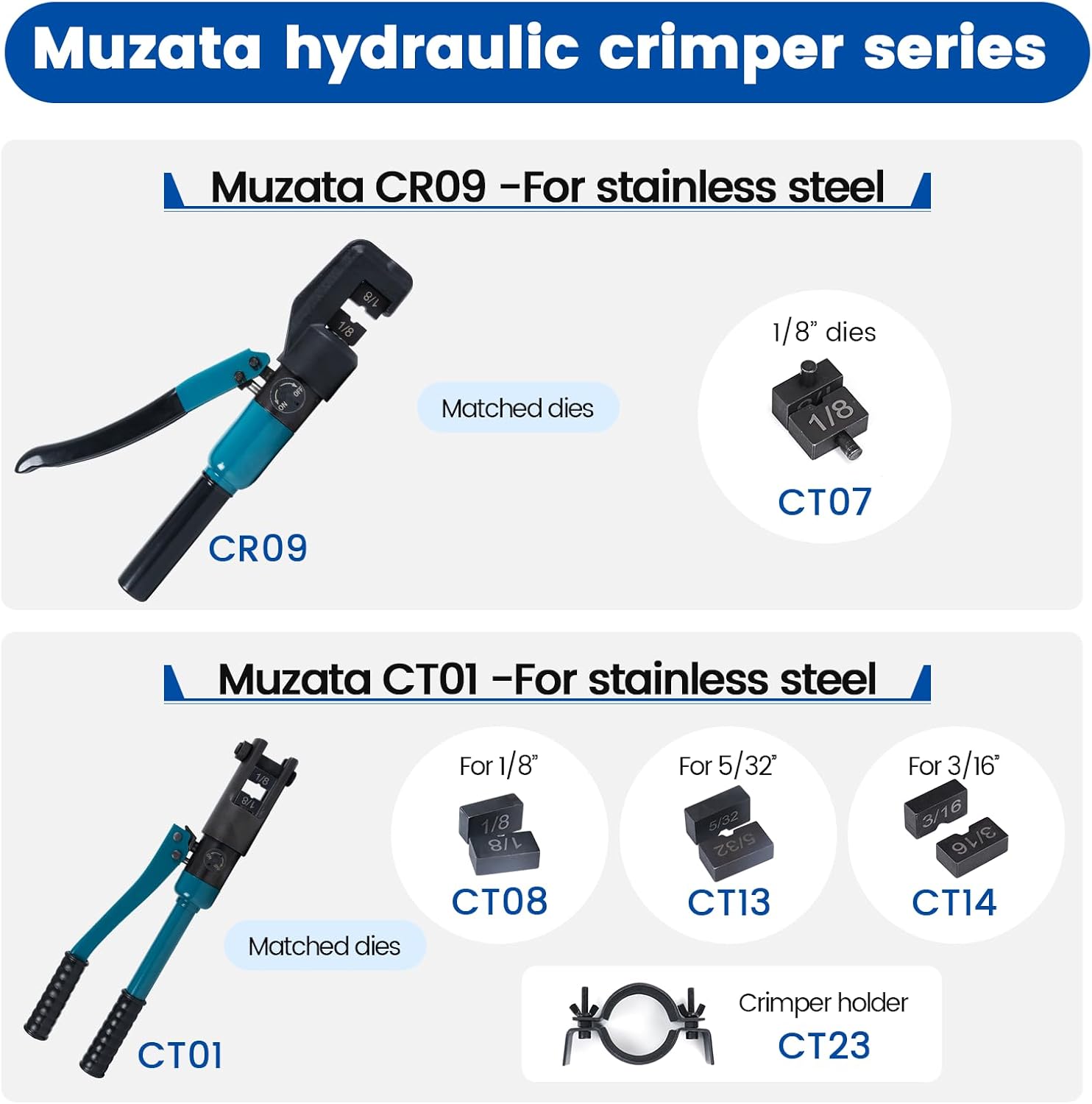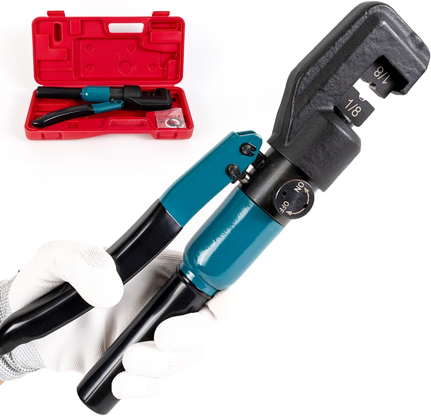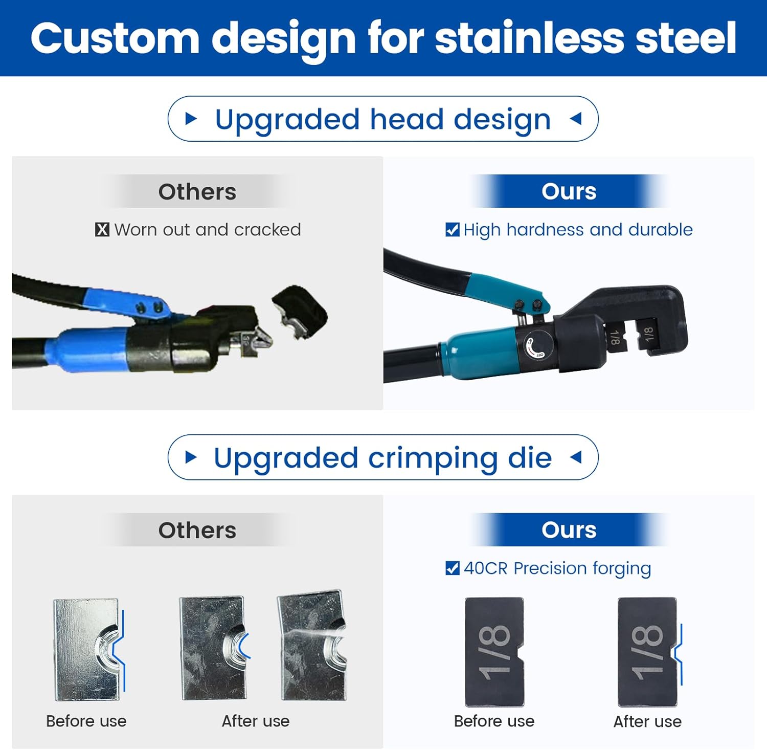 【Cable Railing Crimping Tool】 This cable railing hydraulic crimper is designed for deck cable railing installation, generating sufficient force for a sturdy crimp. Our customized hardened steel dies, specially designed for T316 stainless steel cable railing hardware, are compatible with 1/8″ cable railing kits. The package includes: 1pc hydraulic crimper, 1pair of 1/8″ crimping dies