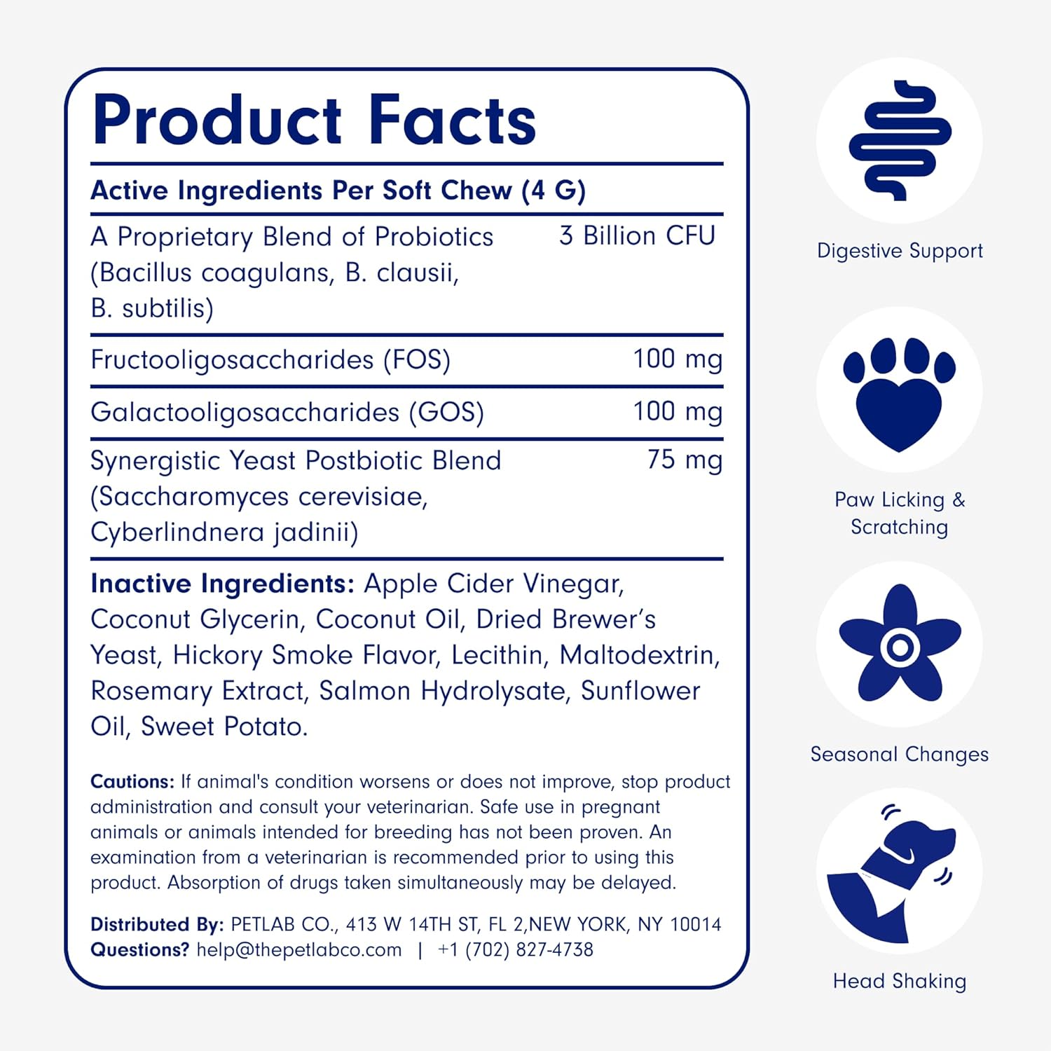 Digestive Health: This probiotic supplement also contains Inulin (a prebiotic for dogs) and Pumpkin for dogs to support digestive health and help counter occasional diarrhea and constipation