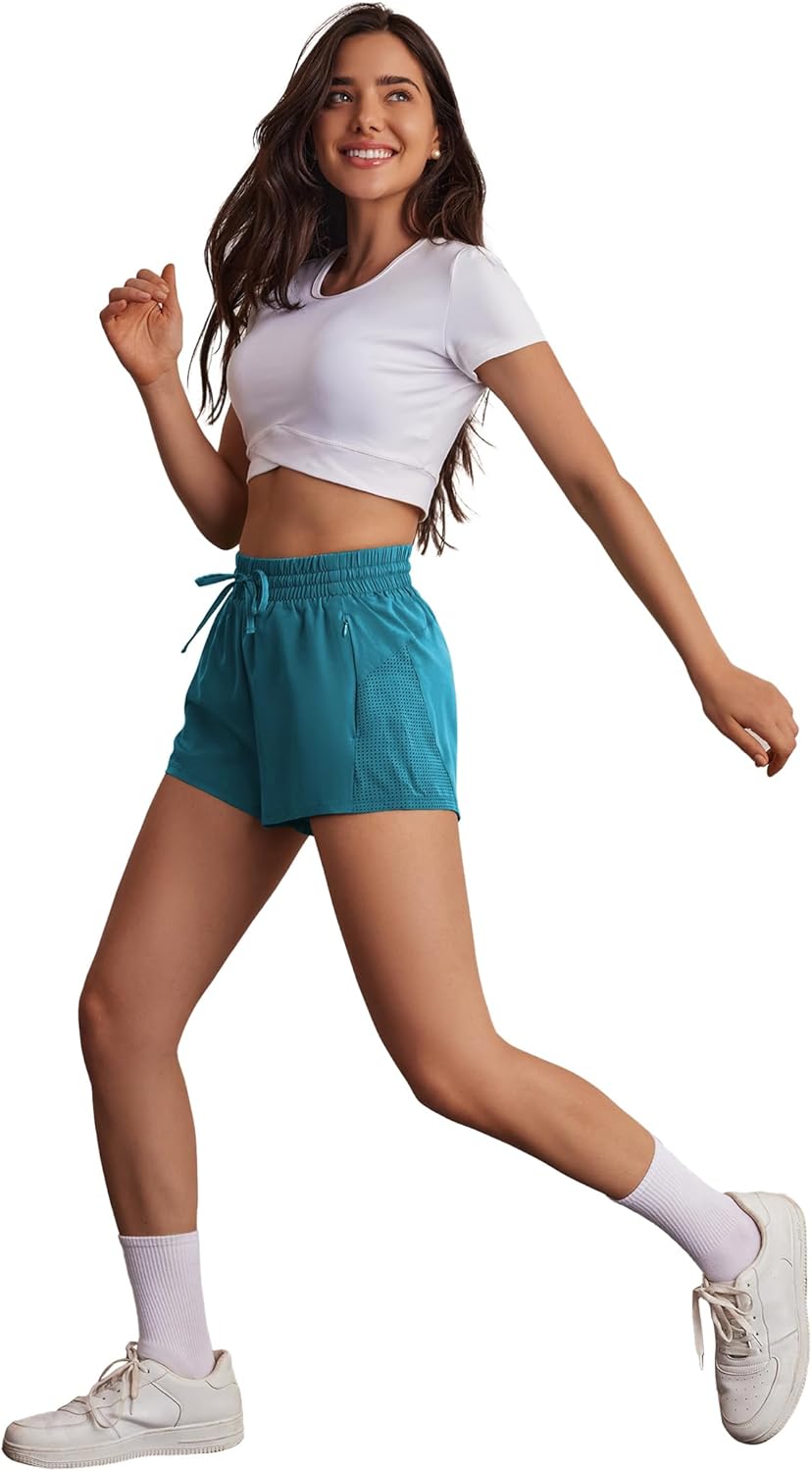 PINSPARK Womens Athletic Shorts High Waisted Running Shorts 2 in 1 Drawstring Quick Dry Gym Shorts with Zipper Pockets